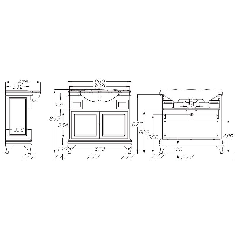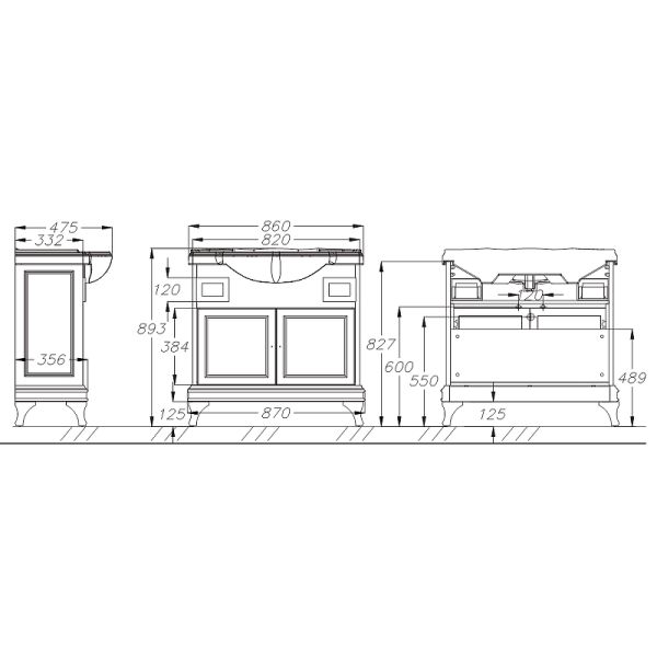 Габариты корпуса тумбы (ШхВхД): 870х827х332 мм.