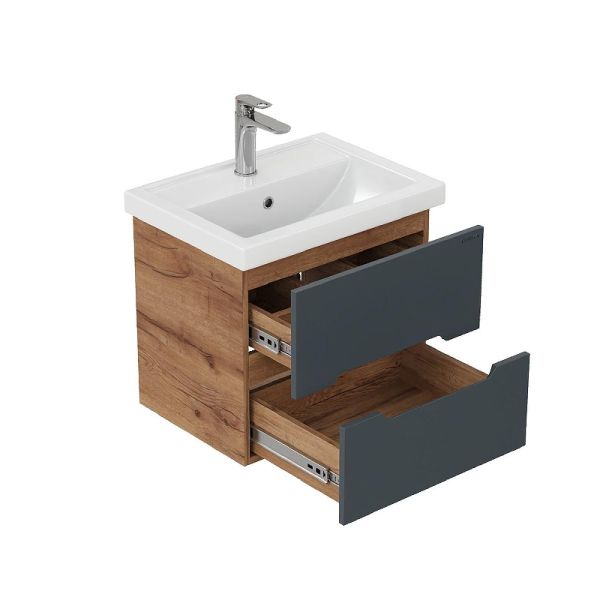 Подвесная тумба Onika Айленд 50 – это отличное решение для ванной комнаты, сочетающее стиль и практичность. Тумба впишется в любой интерьер благодаря трендовому сочетанию матового графита и золотого дуба, а также поможет эффективно организовать пространство, что особенно важно в небольших ванных комнатах.
