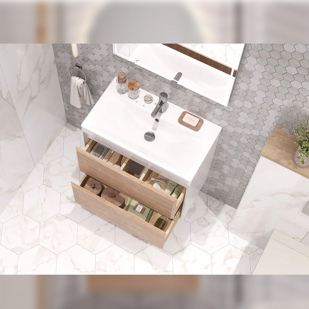 Тумба под раковину подвесная Velvex Gesso tp.GES.9696.70.2Y белый матовый/дуб сонома, 70 см: 2 выдвижных ящика с механизмом открывания push-to-open.