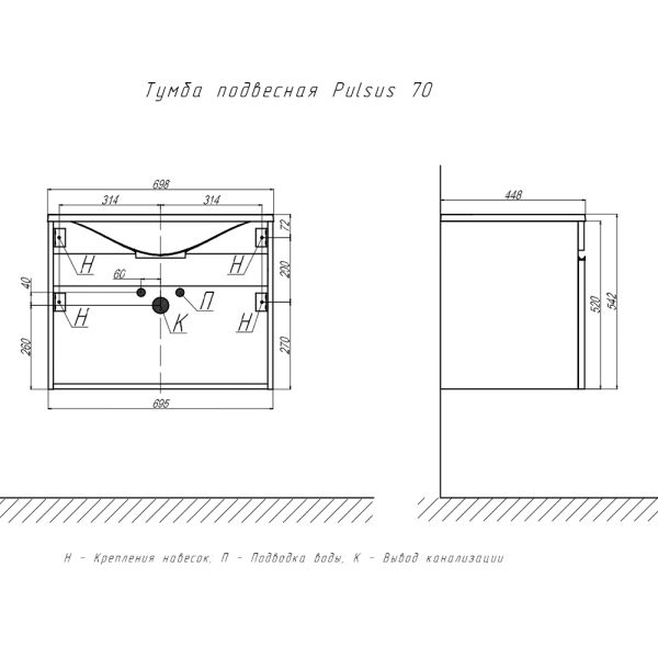 Тумба под раковину подвесная Velvex Pulsus tp.PUL.PUL.70.1Y белый глянец, 70 см