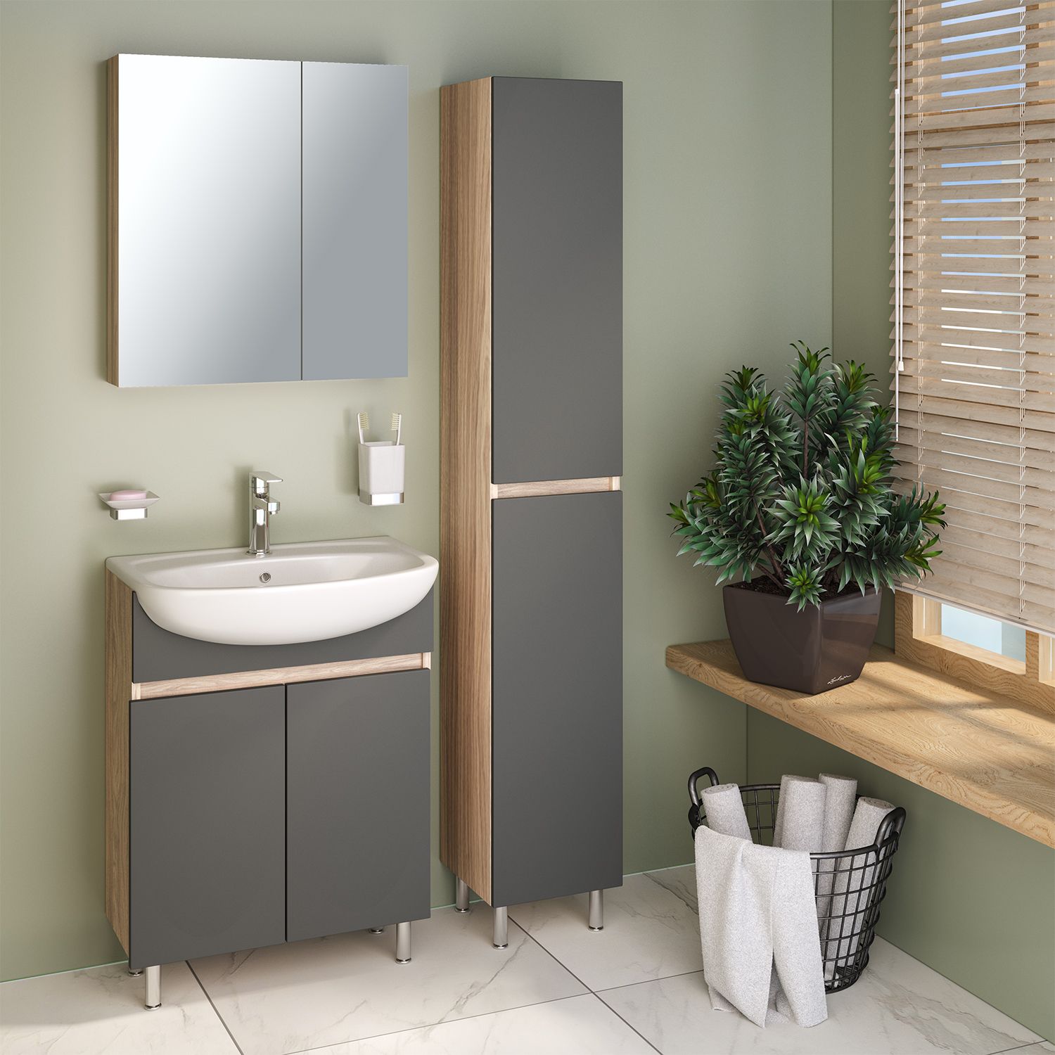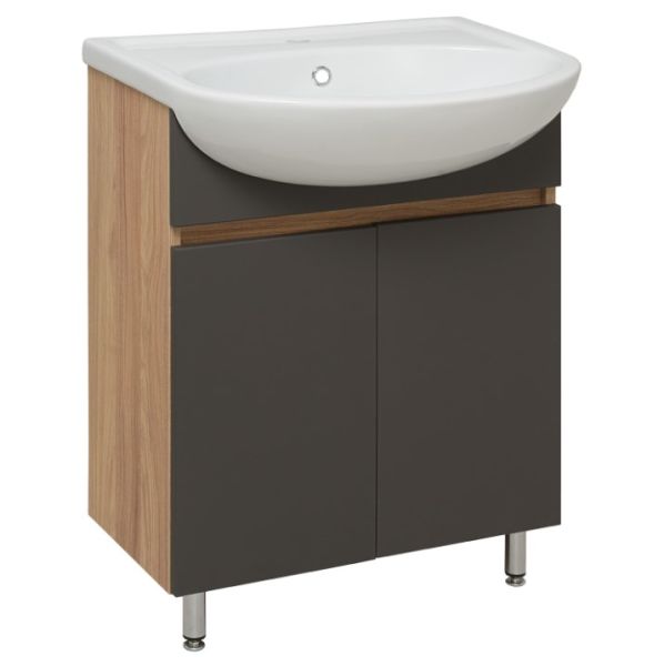 Тумба с раковиной RUNO ЛАДА - модное и оригинальное решение для бюджетного оснащения ванной комнаты. Тумба под раковину ЛАДА (напольная) выполнена в двух цветах - классическом белом и в стильном цвете - графит/серый дуб . Тумба в ванную имеет две распашные дверцы и одну внутреннюю полку. В комплекте идут петли со встроенным доводчиком, 2 хромированные и 2 пластиковые ножки. Тумба для ванной комплектуется керамической раковиной "Уют" (610*470 мм). Раковина имеет глубину 21 см. Раковина имеет глубину 18 см. Мебель для ванной RUNO - красота и практичность в мелочах!