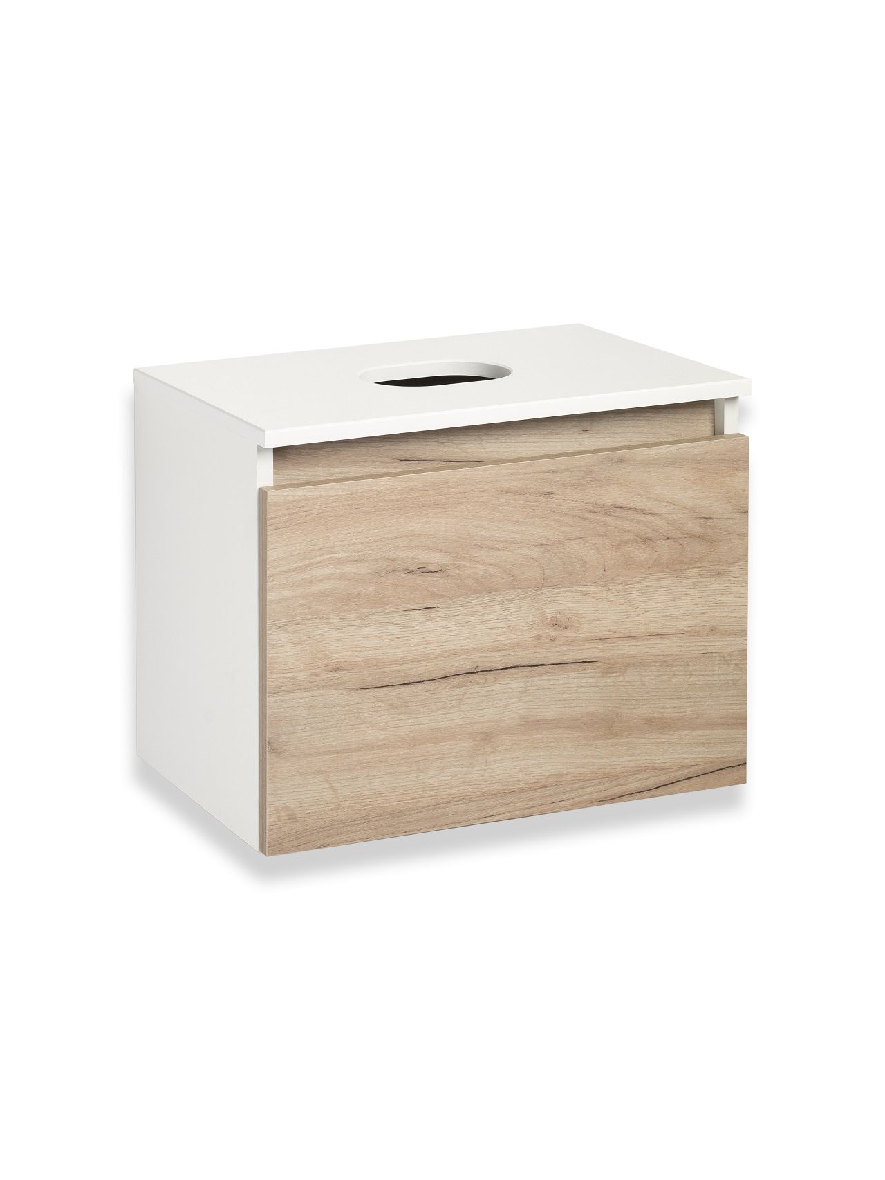 Тумба под раковину в ванную RUNO БАРИ (подвесная) - безупречное сочетание модных тенденций с классическим оформлением ванной комнаты. Тумба под раковину БАРИ оснащена выдвижным ящиком на шариковых направляющих, с системой плавного закрывания. Цвет корпуса классический - белый, при этом цвет фасада в модном цвете – крафтовый дуб, идеально впишутся в любой интерьер ванной комнаты. К тумбе для ванной подойдут умывальники на столешницу: «UNO 24» (24х24см) – очень маленькая модель, идеально подходит для ограниченного пространства в небольших помещениях. Строгая квадратная геометрически правильная форма раковины, усиливает идею лаконичности в дизайне, устанавливается на столешницу, накладным методом. «DUE 38» (38х24см) – маленькая модель, идеально подходит для ограниченного пространства в небольших помещениях. Строгая прямоугольная геометрически правильная форма раковины с округлыми углами, усиливает идею лаконичности в дизайне, устанавливается на столешницу, накладным методом.