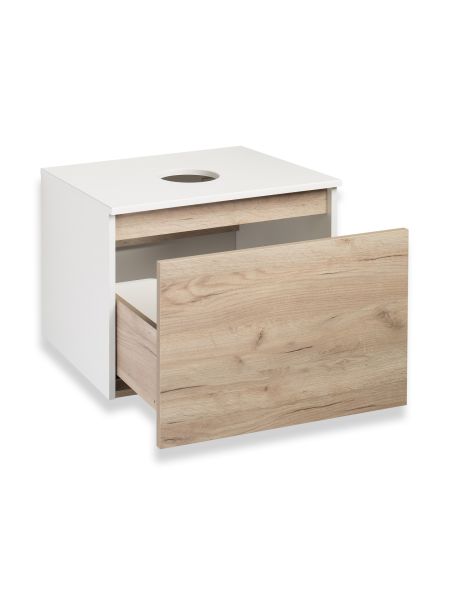 Тумба под раковину в ванную RUNO БАРИ (подвесная) - безупречное сочетание модных тенденций с классическим оформлением ванной комнаты. Тумба под раковину БАРИ оснащена выдвижным ящиком на шариковых направляющих, с системой плавного закрывания. Цвет корпуса классический - белый, при этом цвет фасада в модном цвете – крафтовый дуб, идеально впишутся в любой интерьер ванной комнаты. К тумбе для ванной подойдут умывальники на столешницу: «OVALE 50» (50х36см) - идеальное решение для стильного интерьера ванной, создан для минималистичных интерьеров и подойдёт для санузлов в стиле лофт, минимализм и хай-тек. Строгая овальная геометрически правильная форма раковины, усиливает идею лаконичности в дизайне, устанавливается на столешницу, накладным методом. «PALLA D41» (диаметр 41см) - идеальное решение для стильного интерьера ванной, создан для минималистичных интерьеров и подойдёт для санузлов в стиле лофт, минимализм и хай-тек. Строгая круглая геометрически правильная форма раковины, усиливает идею лаконичности в дизайне, устанавливается на столешницу, накладным методом. «TRE 48» (48х37см) - идеальное решение для стильного интерьера ванной, создан для минималистичных интерьеров и подойдёт для санузлов в стиле лофт, минимализм и Хай-Тек. Строгая прямоугольная форма с округлыми углами усиливает идею лаконичности в дизайне, устанавливается на столешницу, накладным методом. «TERZO 60» (59х39см) - идеальное решение для стильного интерьера ванной, создан для минималистичных интерьеров и подойдёт для санузлов в стиле лофт, минимализм и хай-тек. Асимметричная раковина, которую можно установить любой стороной, дизайнерское решение для нестандартных интерьеров, усиливает идею лаконичности в дизайне, устанавливается на столешницу, накладным методом.