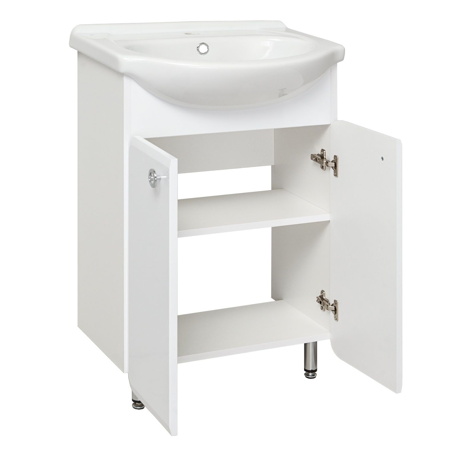 Тумба под умывальник напольная с двумя распашными дверками и одной внутренней полкой. Петли со встроенным доводчиком, ручки - 2шт, ножки хром - 2шт, ножки пластик -2шт.