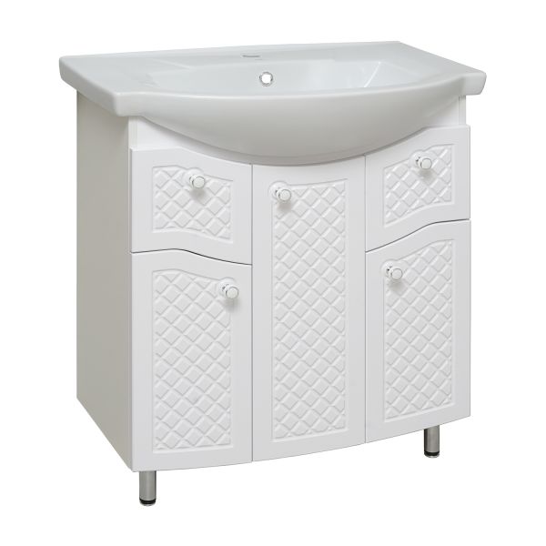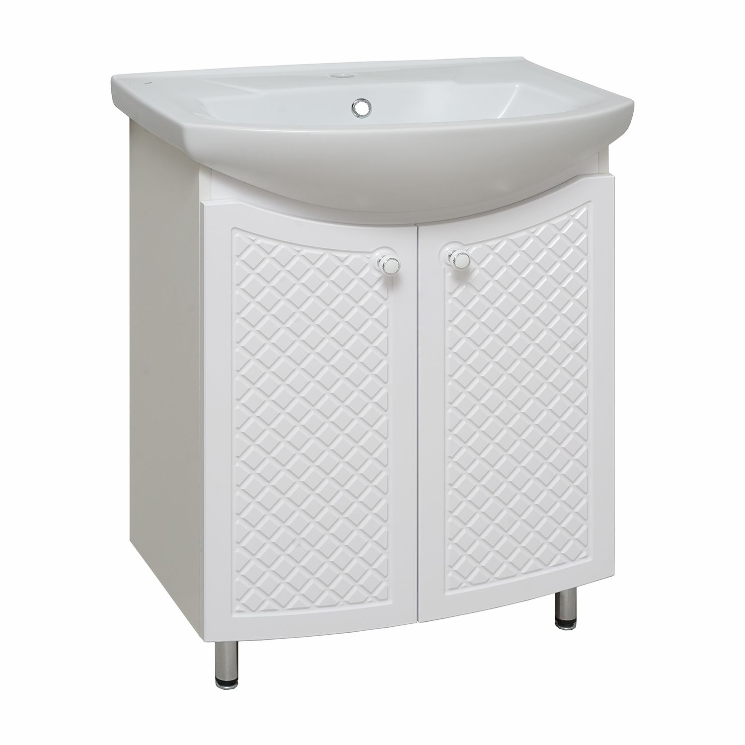 Тумба под умывальник напольная с двумя распашными дверками и одной внутренней полкой. Петли со встроенным доводчиком, ручки - 2шт, ножки хром - 2шт, ножки пластик -2шт.