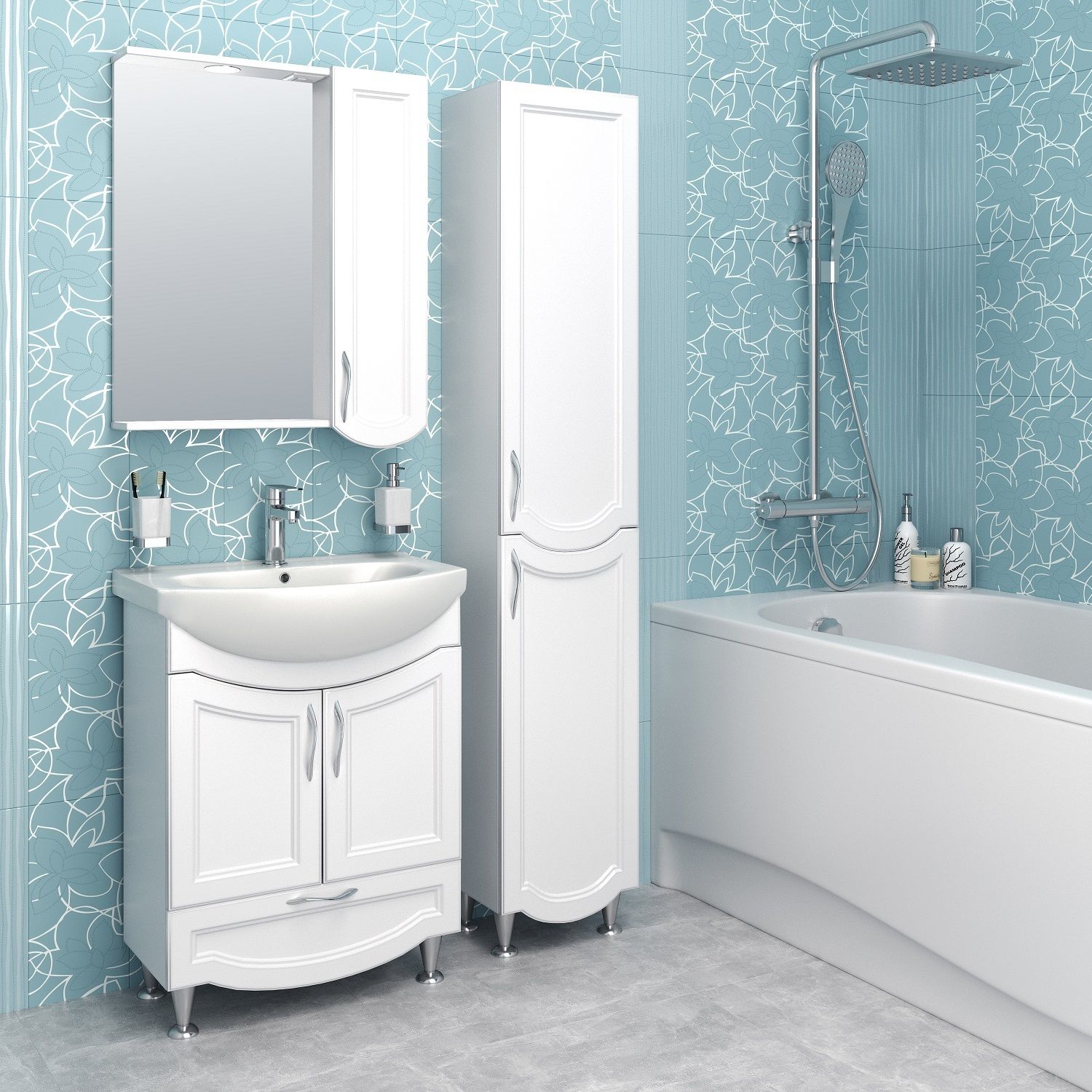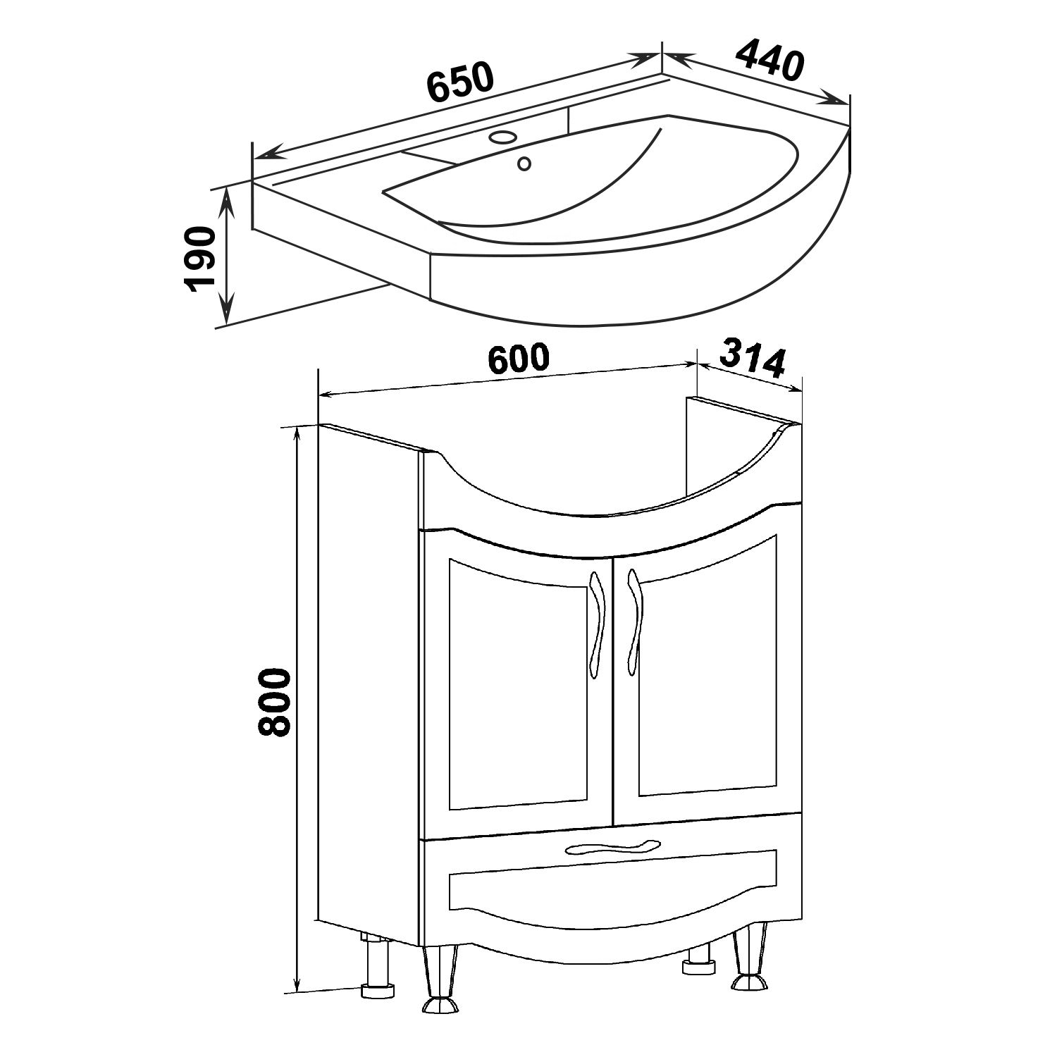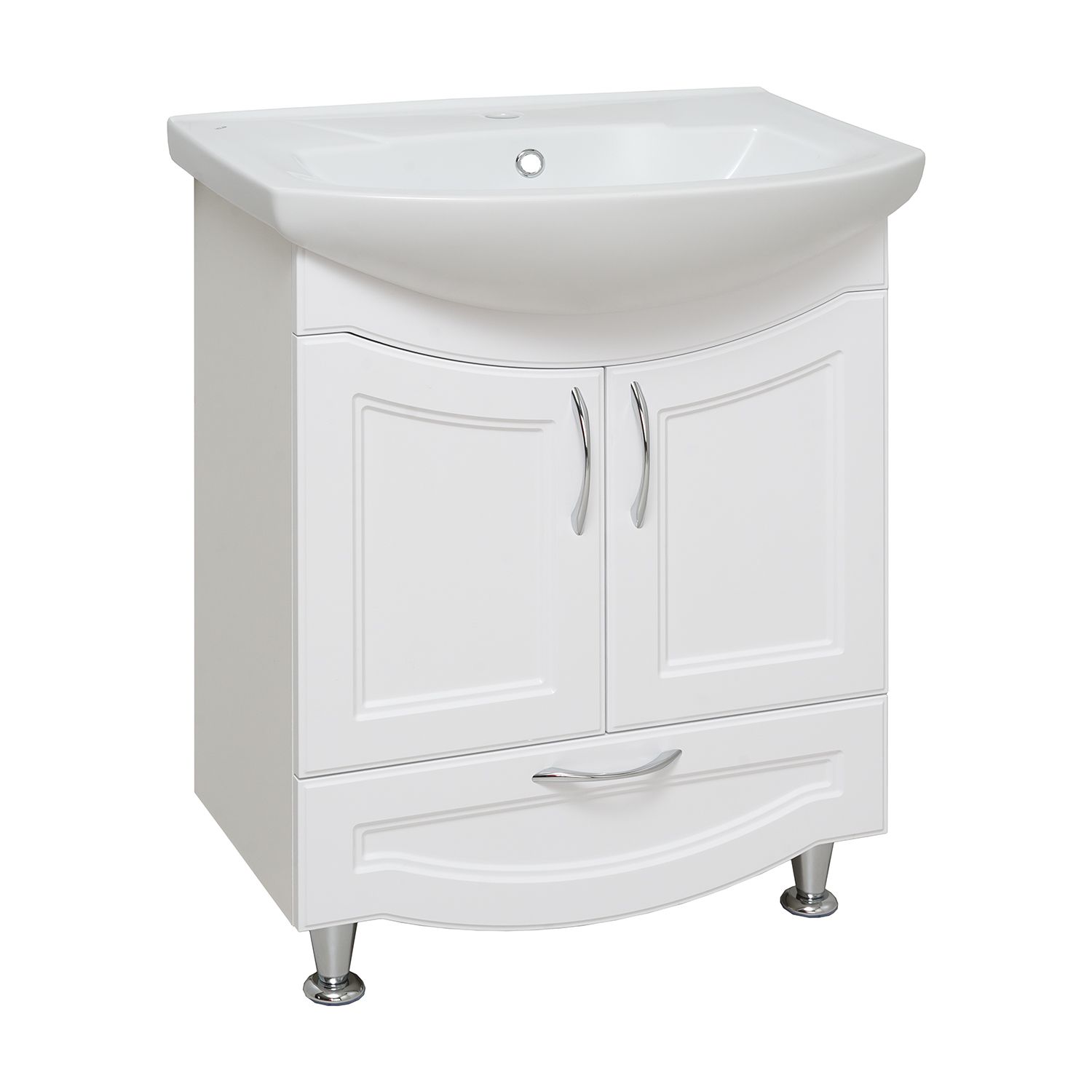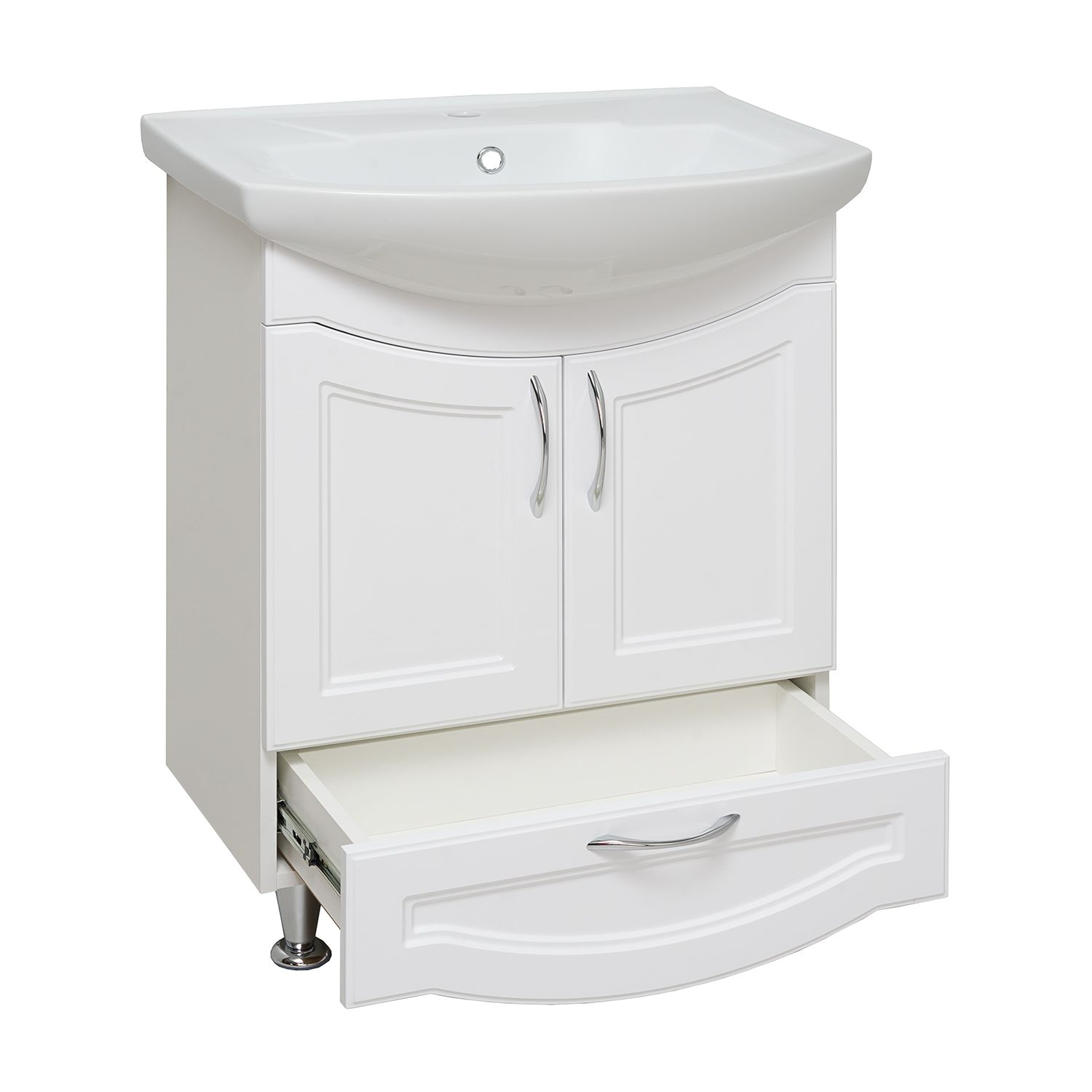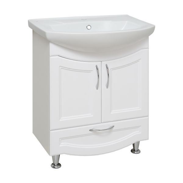 Тумба под умывальник напольная с двумя распашными дверками и нижним выдвижным ящиком. За фасадами - одна встроенная полка. Петли со встроенным доводчиком, ящик - на шариковых направляющих полного выдвижения, ручки - 3шт, ножки хром - 2шт, ножки пластик -2шт.
