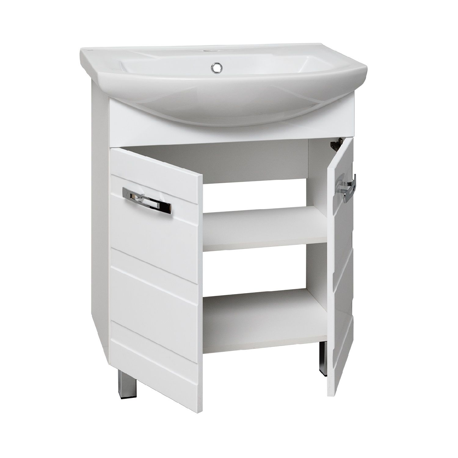 Тумба под умывальник напольная с двумя распашными фасадами и одной внутренней полкой. Петли со встроенным доводчиком, ручки - 2шт, ножки хром - 2шт, ножки пластик -2шт.