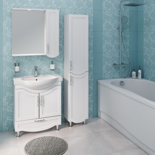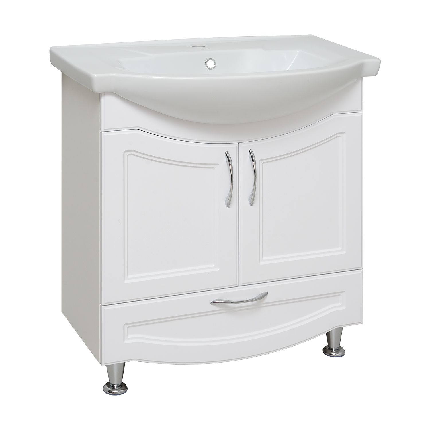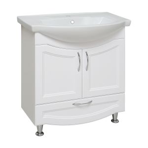 Тумба под умывальник напольная с двумя распашными дверками и нижним выдвижным ящиком. За фасадами - одна встроенная полка. Петли со встроенным доводчиком, ящик - на шариковых направляющих полного выдвижения, ручки - 3шт, ножки хром - 2шт, ножки пластик -2шт.
