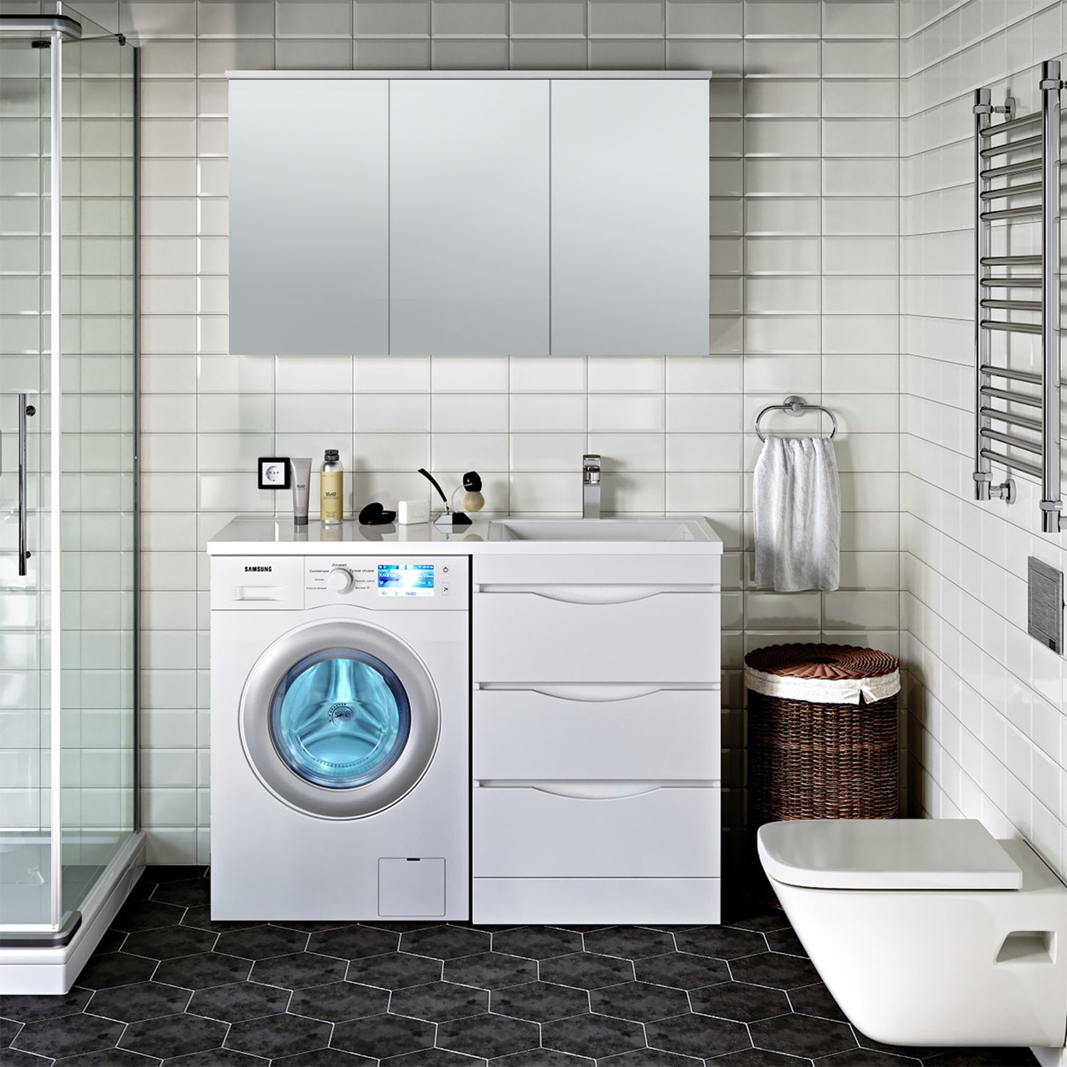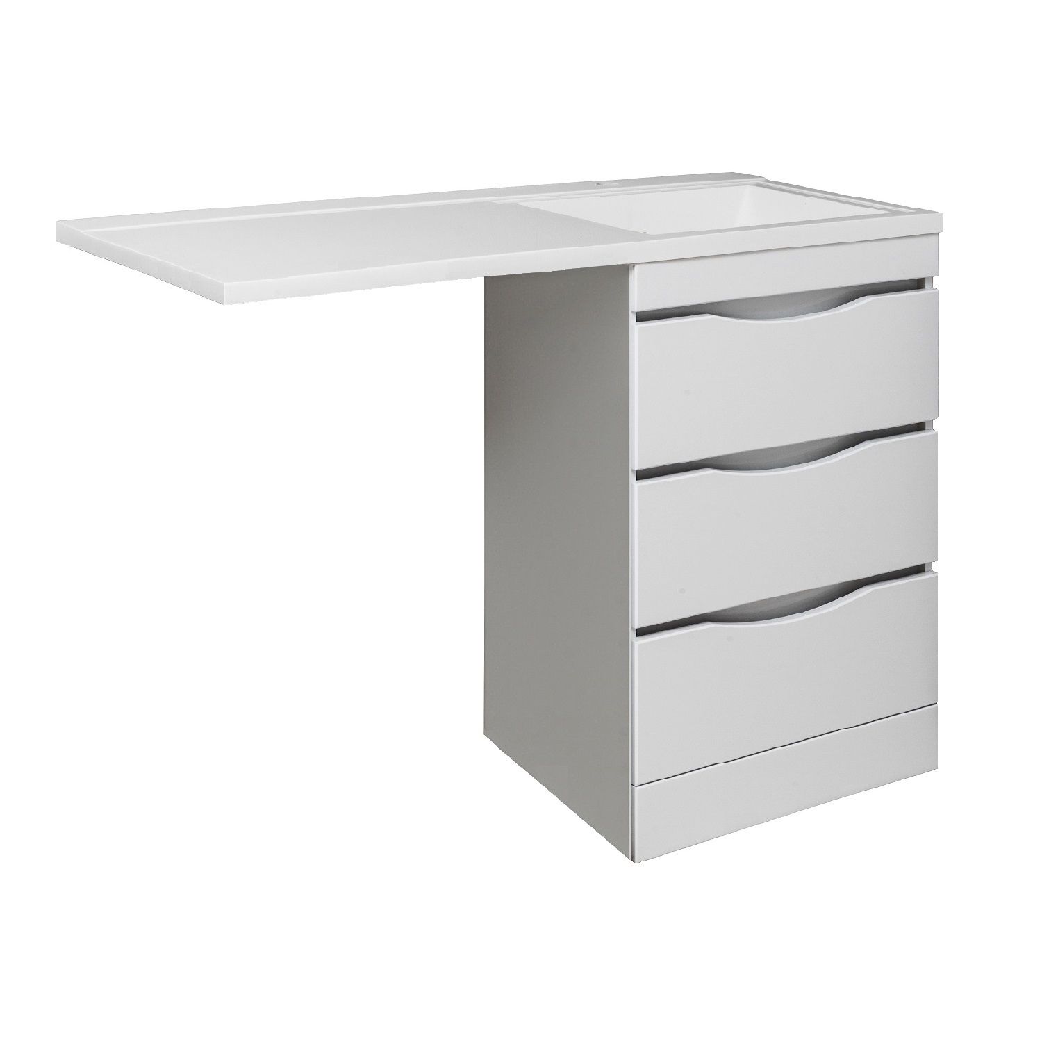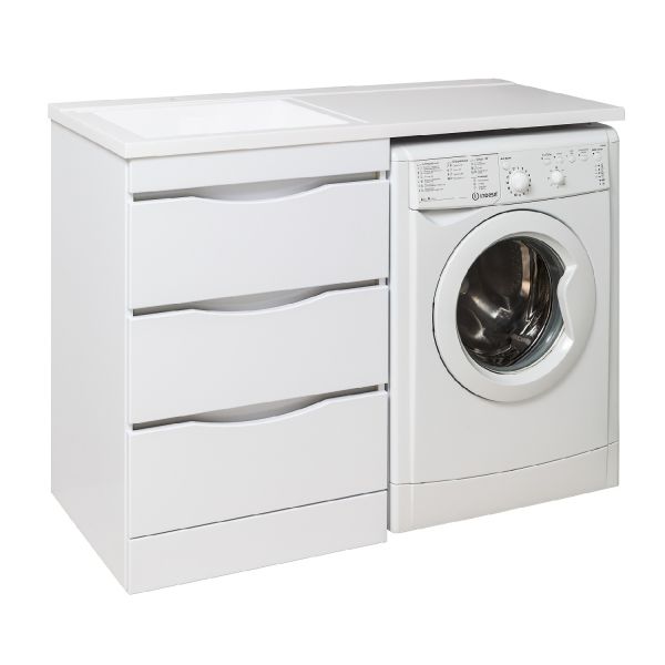 Тумба под умывальник напольная с тремя выдвижными ящиками на шариковых направляющих скрытого монтажа с доводчиком. Устанавливается на 4-е пластиковые опоры, скрытые за нижней съемной фальшь-панелью. Комплект предусматривает установку стиральной машины под крылом умывальника слева от тумбы. Умывальник из литьевого мрамора "Gamma 120 лайт" устанавливается на тумбу и кронштейн.