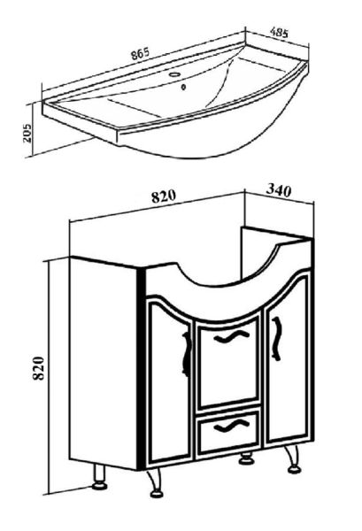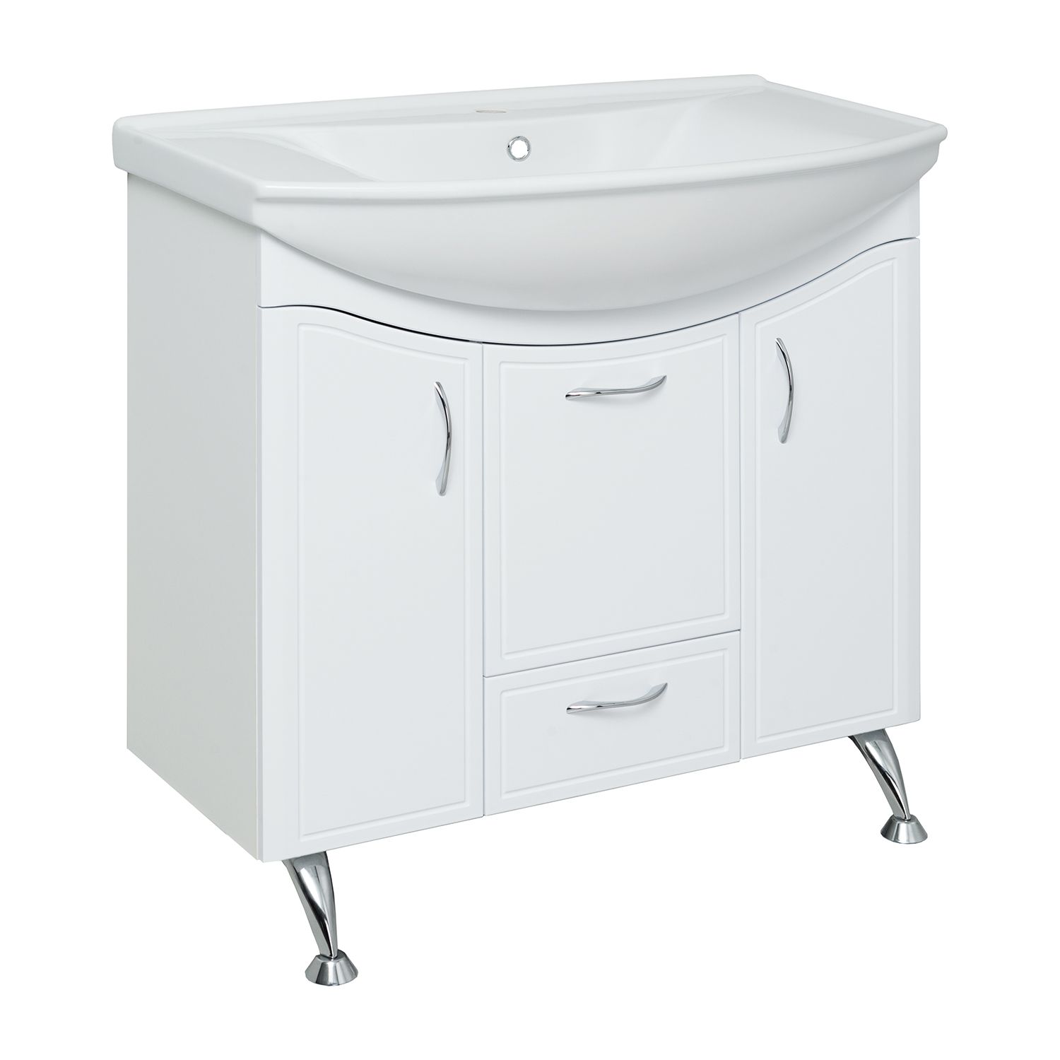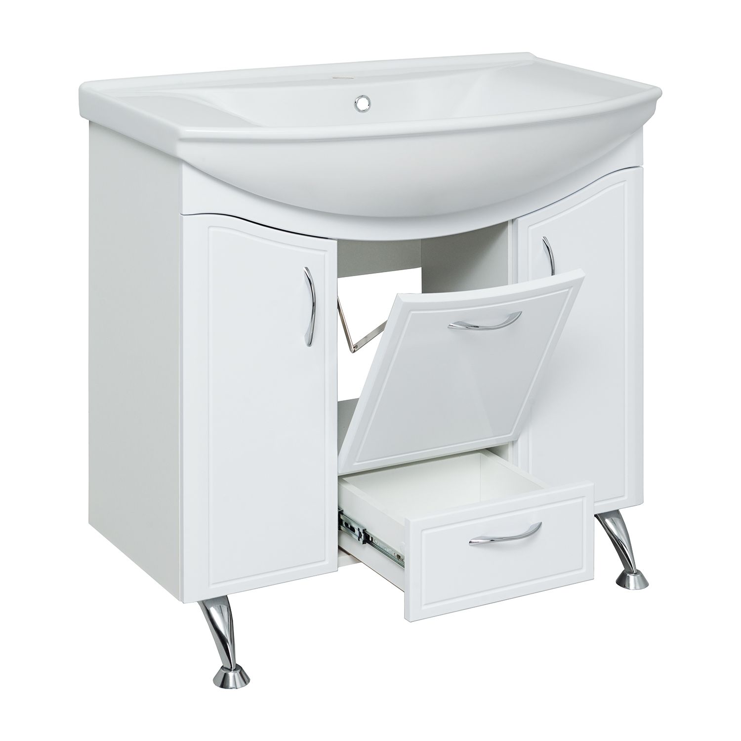 Тумба под умывальник напольная с двумя распашными фасадами, откидной дверкой посередине и нижним выдвижным ящиком. За каждой дверкой -по одной внутренней полке. Петли со встроенным доводчиком, ящик - на шариковых направляющих полного выдвижения, ручки - 4шт, ножки хром -2шт, ножки пластик - 2шт.