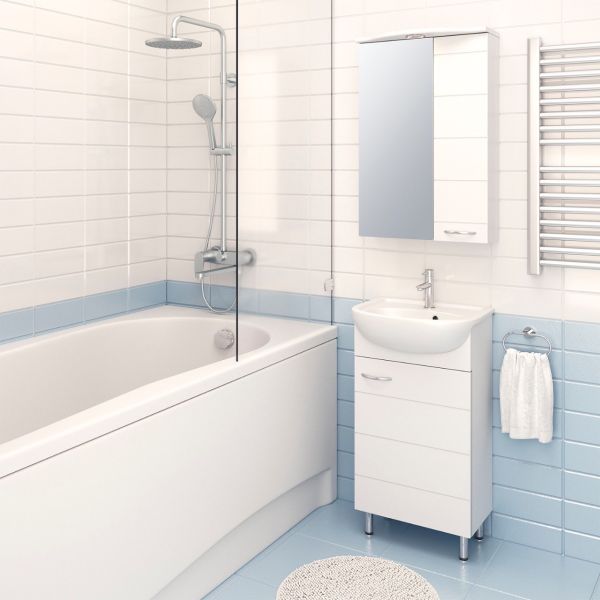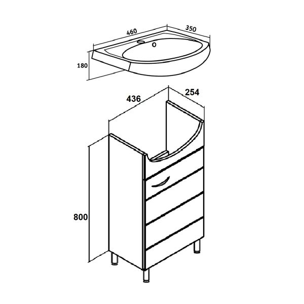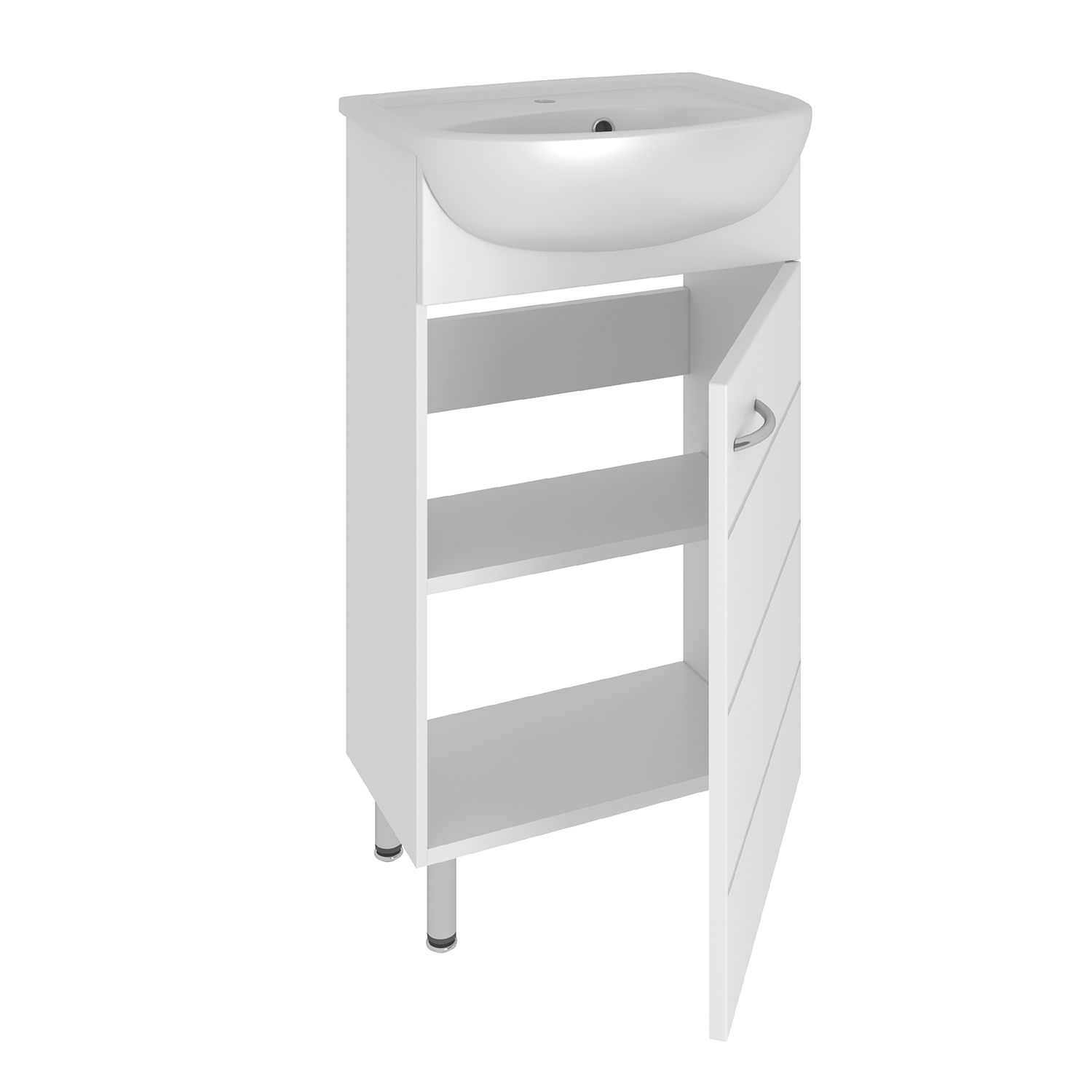 Тумба под умывальник напольная с одним распашным фасадом, открывающимся слева направо (петли справа). Петли со встроенным доводчиком, ручка - 1шт, ножки хром - 2шт, ножки пластик -2шт.