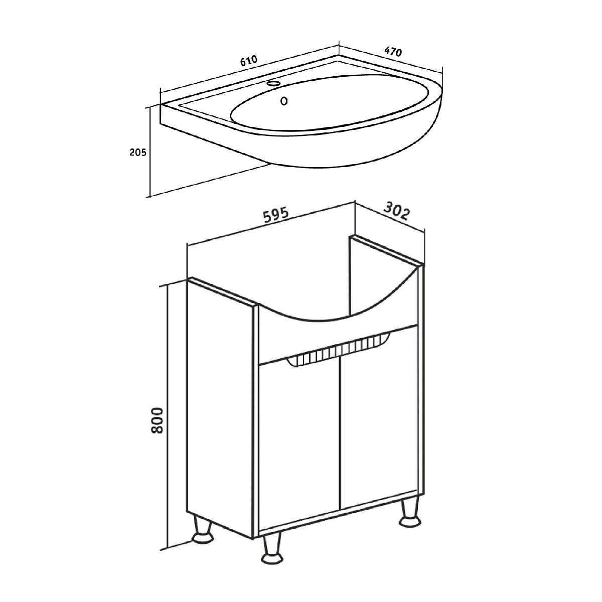 Тумба под умывальник напольная с двумя распашными фасадами и одной внутренней полкой. Ножки хром - 2шт, ножки пластик -2шт.