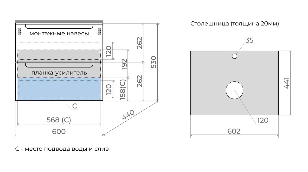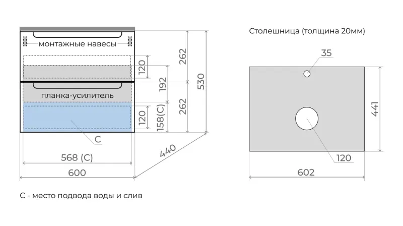 • Тумба подвесная со столешницей (ш/г/в): 600x450x530 мм