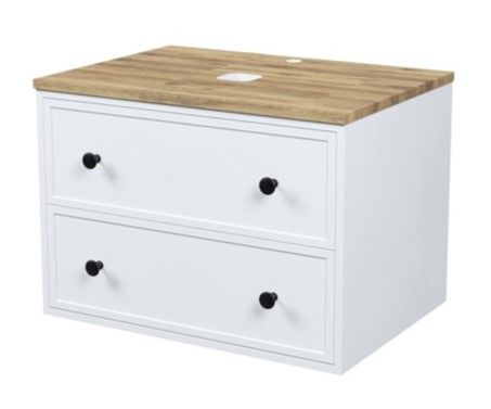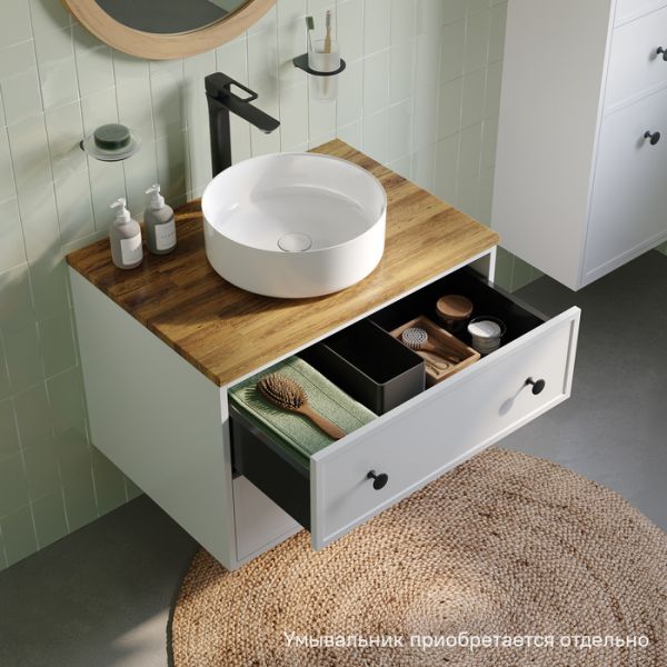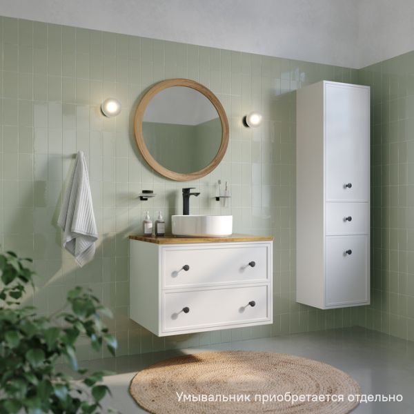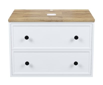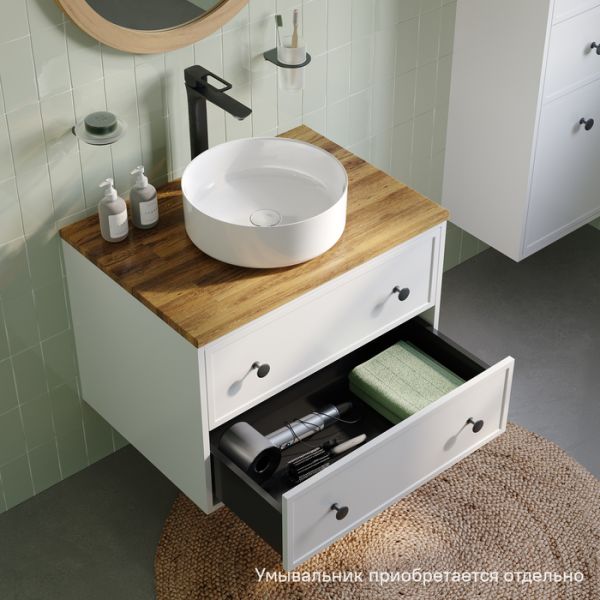 Компактная подвесная тумба Torr классического молочно-белого цвета со столешницей из клееного натурального дуба. Сочетает в себе узнаваемый стиль и практичность популярного скандинавского дизайна. Ее четкие формы, теплый цвет дерева, фасады с декоративной филенкой, круглые ручки смотрятся гармонично и впишутся в любой современный интерьер. Подойдет любой накладной умывальник, покупается отдельно.