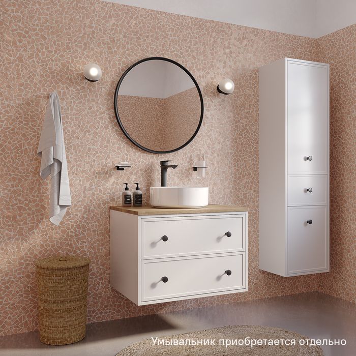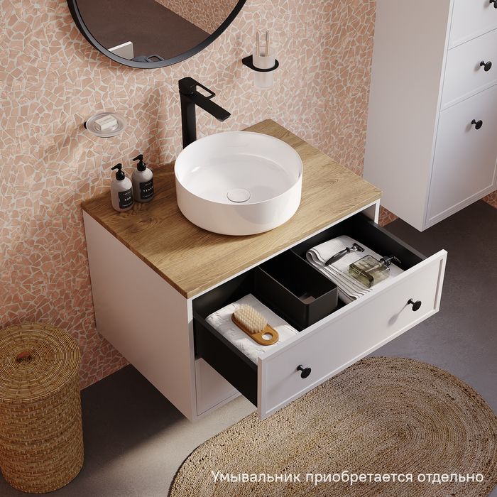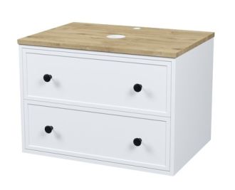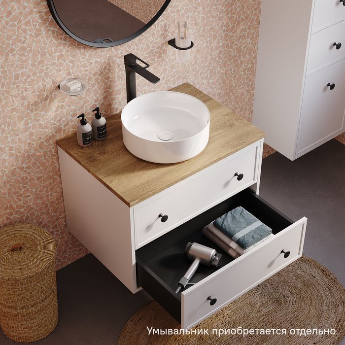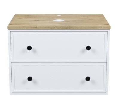 Компактная подвесная тумба Torr классического молочно-белого цвета со столешницей из МДФ в оттенке дуба верона. Сочетает в себе узнаваемый стиль и практичность популярного скандинавского дизайна. Ее четкие формы, теплый цвет дерева, фасады с декоративной филенкой, круглые ручки смотрятся гармонично и впишутся в любой современный интерьер. Подойдет любой накладной умывальник, покупается отдельно.