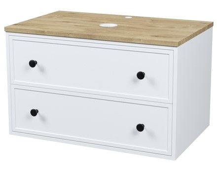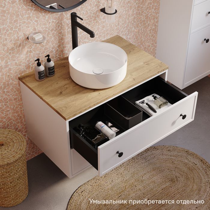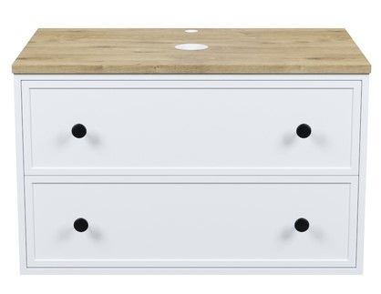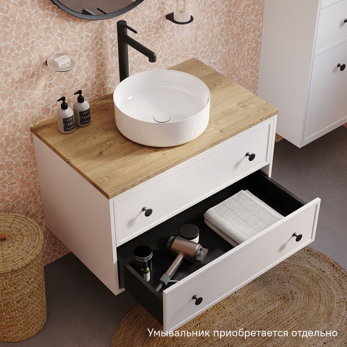 Вместительная подвесная тумба Torr классического молочно-белого цвета со столешницей из МДФ в оттенке дуба верона. Сочетает в себе узнаваемый стиль и практичность популярного скандинавского дизайна. Ее четкие формы, теплый цвет столешницы, фасады с декоративной филенкой, круглые ручки смотрятся гармонично и впишутся в любой современный интерьер. Подойдет любой накладной умывальник, покупается отдельно.