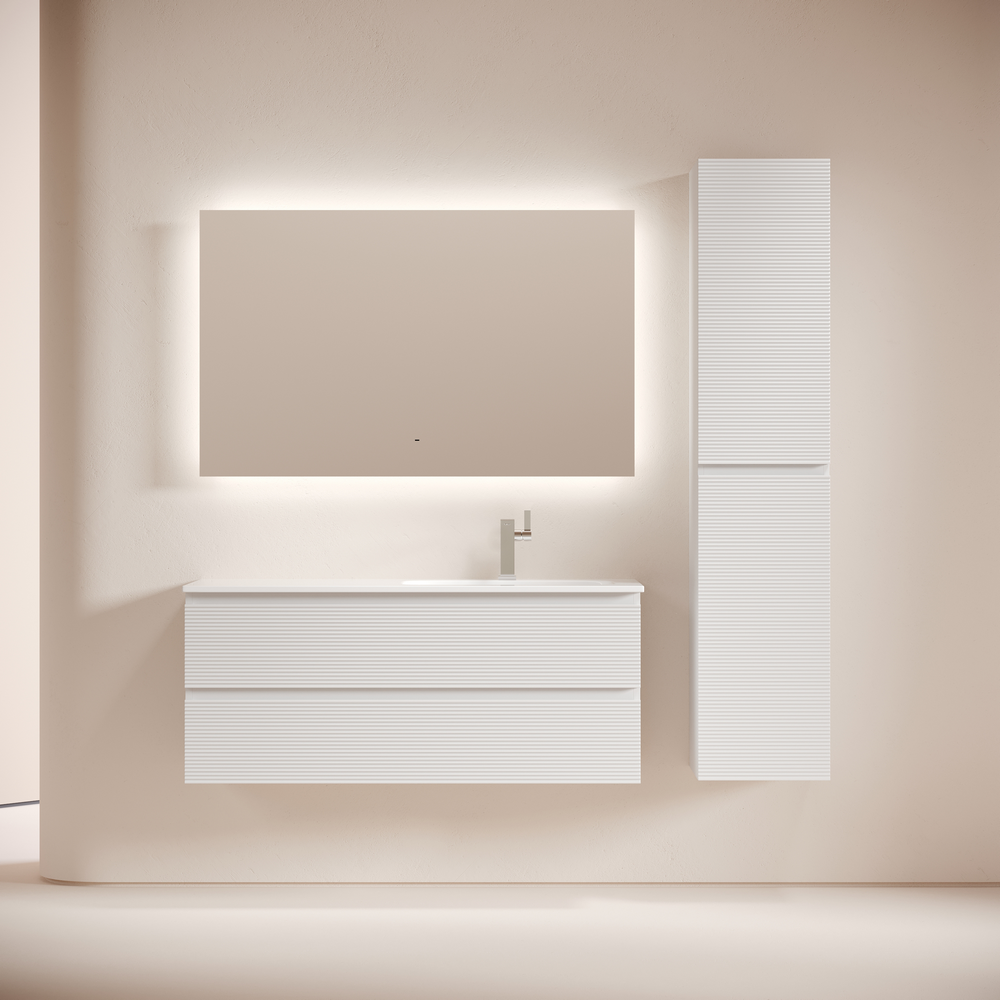 На изображении тумба Folk представлена с зеркалом Square 120 SQ120 и смесителем из коллекции Linn SC9019CH, раковиной Grace CN7021