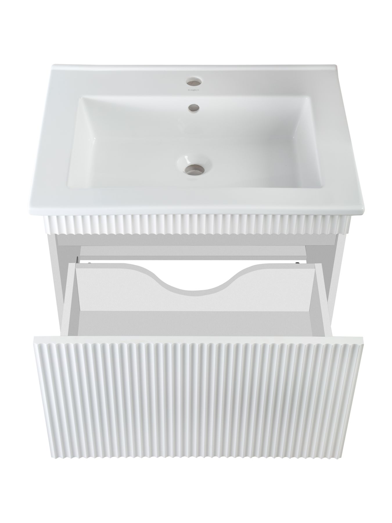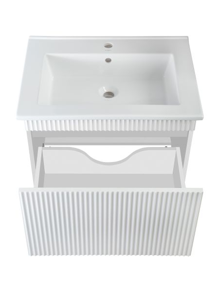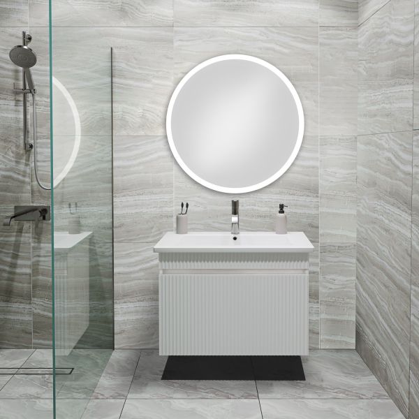 Тумба под раковину МОДЕНА (подвесная) – это изысканность и утончённая роскошь в интерьере. Волнистые рифленые фасады визуально «оживляют» и «приводят в движение» всю обстановку комнаты, сохраняя при этом умиротворение и покой, превосходно сочетаются с классическим белым цветом корпуса. Цвет фасада также классический – белый глянец, идеально впишется в любой интерьер ванной комнаты. Тумба для ванной оснащена выдвижным ящиком на шариковых направляющих, к тумбе для ванной подходит накладная керамическая раковина «Оскар» (770х470 мм). Раковина глубиной 19 см. Мебель для ванной RUNO - красота и практичность в мелочах, тумба под раковину для ванной комнаты Модена – лучший выбор для Вашей ванной комнаты!