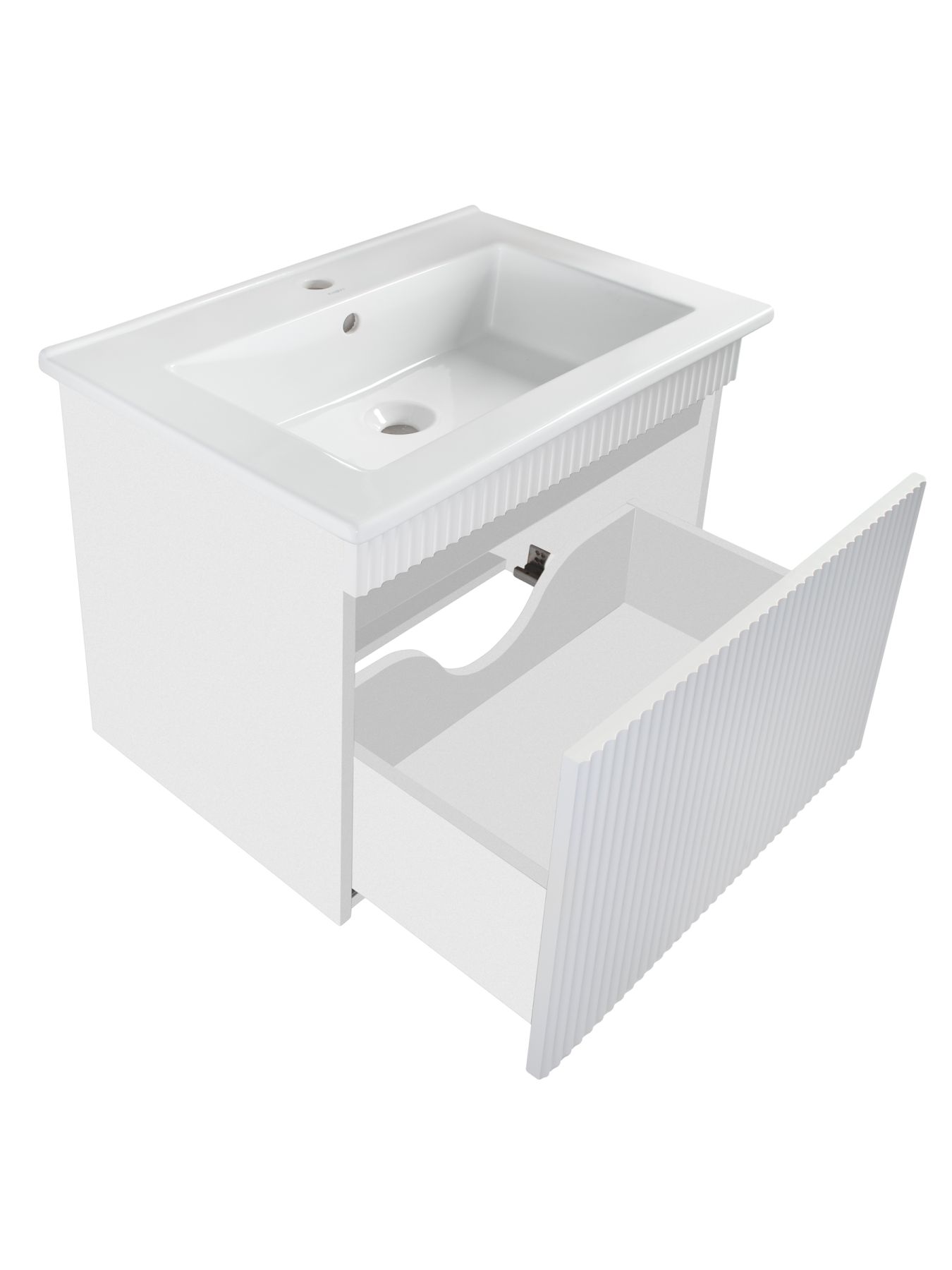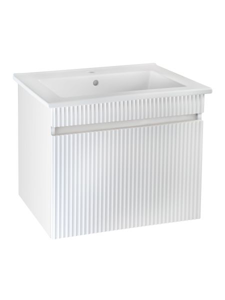 Тумба под раковину МОДЕНА (напольная) – это изысканность и утончённая роскошь в интерьере. Волнистые рифленые фасады визуально «оживляют» и «приводят в движение» всю обстановку комнаты, сохраняя при этом умиротворение и покой, превосходно сочетаются с классическим белым цветом корпуса. Цвет фасада также классический – белый глянец, идеально впишется в любой интерьер ванной комнаты. Тумба для ванной оснащена двумя выдвижными ящиками на шариковых направляющих, к тумбе для ванной подходит накладная керамическая раковина «Оскар» (770х470 мм). Раковина глубиной 19 см. Мебель для ванной RUNO - красота и практичность в мелочах, тумба под раковину для ванной комнаты Модена – лучший выбор для Вашей ванной комнаты!