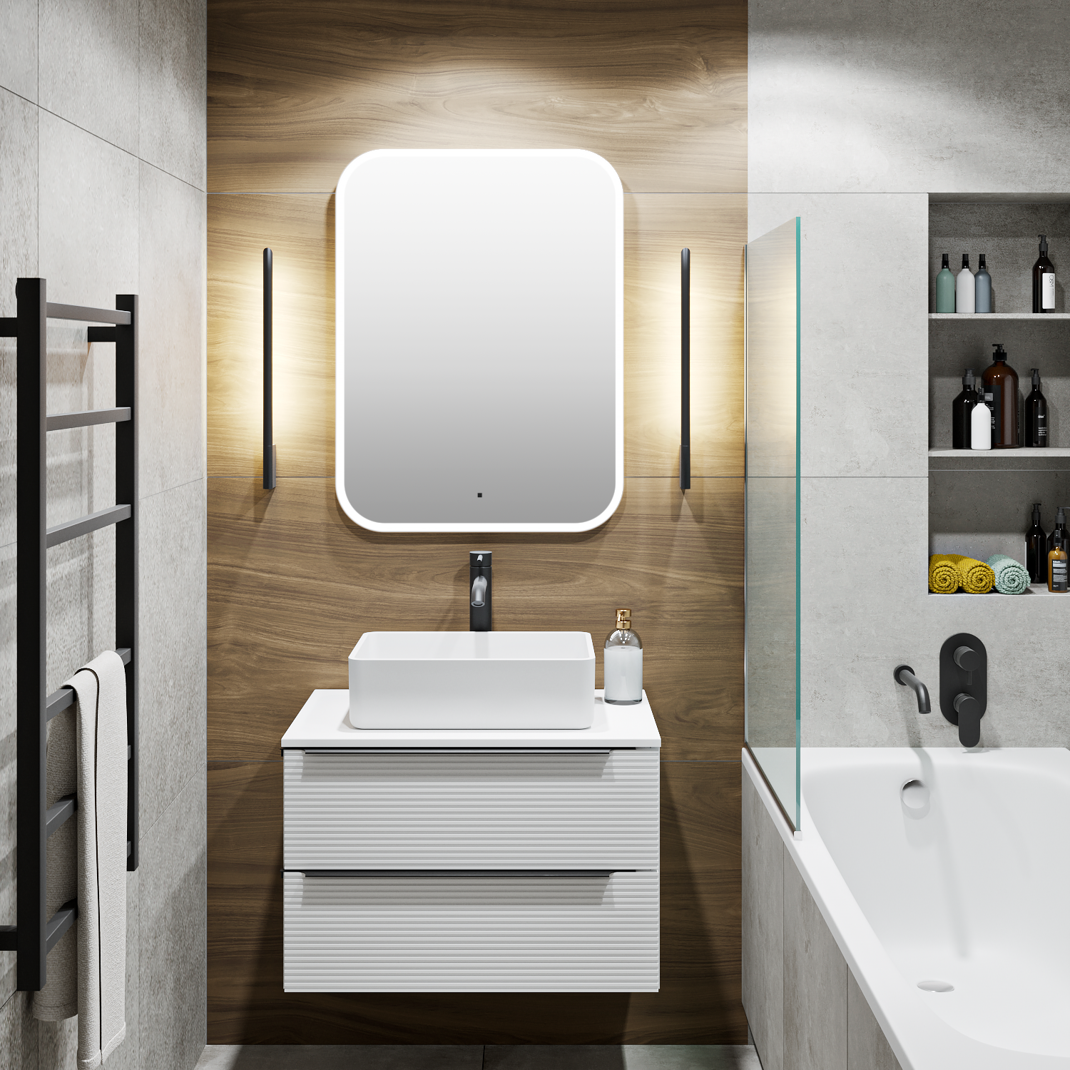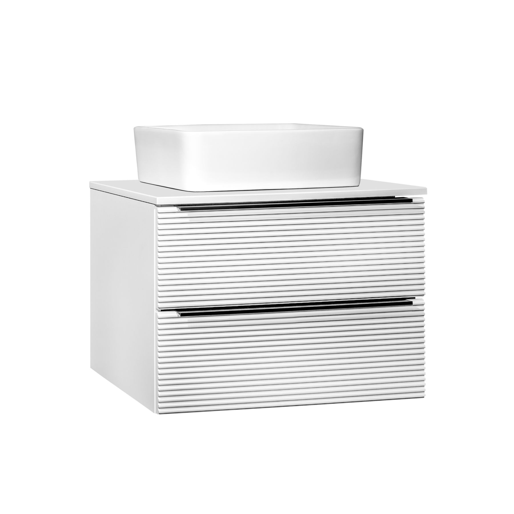 Тумба под раковину в ванную RUNO Орлеан (подвесная) – это изысканность и утончённая роскошь в интерьере. Рифленые фасады визуально «оживляют» и «приводят в движение» всю обстановку комнаты, сохраняя при этом умиротворение и покой. Цвета корпуса и фасада имеют идеальное классическое цветовое сочетание глянцевого и матового белого цвета, которые идеально впишутся в любой интерьер ванной комнаты. Тумба в ванную оснащена двумя выдвижными ящиками на шариковых направляющих, оснащенных системой плавного закрывания. В комплекте входят: две металлические ручки, навесы для крепления к стене. К тумбе для ванной подойдут умывальники на столешницу: «OVALE 50» (50х36см) - идеальное решение для стильного интерьера ванной, создан для минималистичных интерьеров и подойдёт для санузлов в стиле лофт, минимализм и хай-тек. Строгая овальная геометрически правильная форма раковины, усиливает идею лаконичности в дизайне, устанавливается на столешницу, накладным методом. «PALLA D41» (диаметр 41см) - идеальное решение для стильного интерьера ванной, создан для минималистичных интерьеров и подойдёт для санузлов в стиле лофт, минимализм и хай-тек. Строгая круглая геометрически правильная форма раковины, усиливает идею лаконичности в дизайне, устанавливается на столешницу, накладным методом. «TRE 48» (48х37см) - идеальное решение для стильного интерьера ванной, создан для минималистичных интерьеров и подойдёт для санузлов в стиле лофт, минимализм и Хай-Тек. Строгая прямоугольная форма с округлыми углами усиливает идею лаконичности в дизайне, устанавливается на столешницу, накладным методом. «TERZO 60» (59х39см) - идеальное решение для стильного интерьера ванной, создан для минималистичных интерьеров и подойдёт для санузлов в стиле лофт, минимализм и хай-тек. Асимметричная раковина, которую можно установить любой стороной, дизайнерское решение для нестандартных интерьеров, усиливает идею лаконичности в дизайне, устанавливается на столешницу, накладным методом. И другие накладные раковины бренда RUNO.