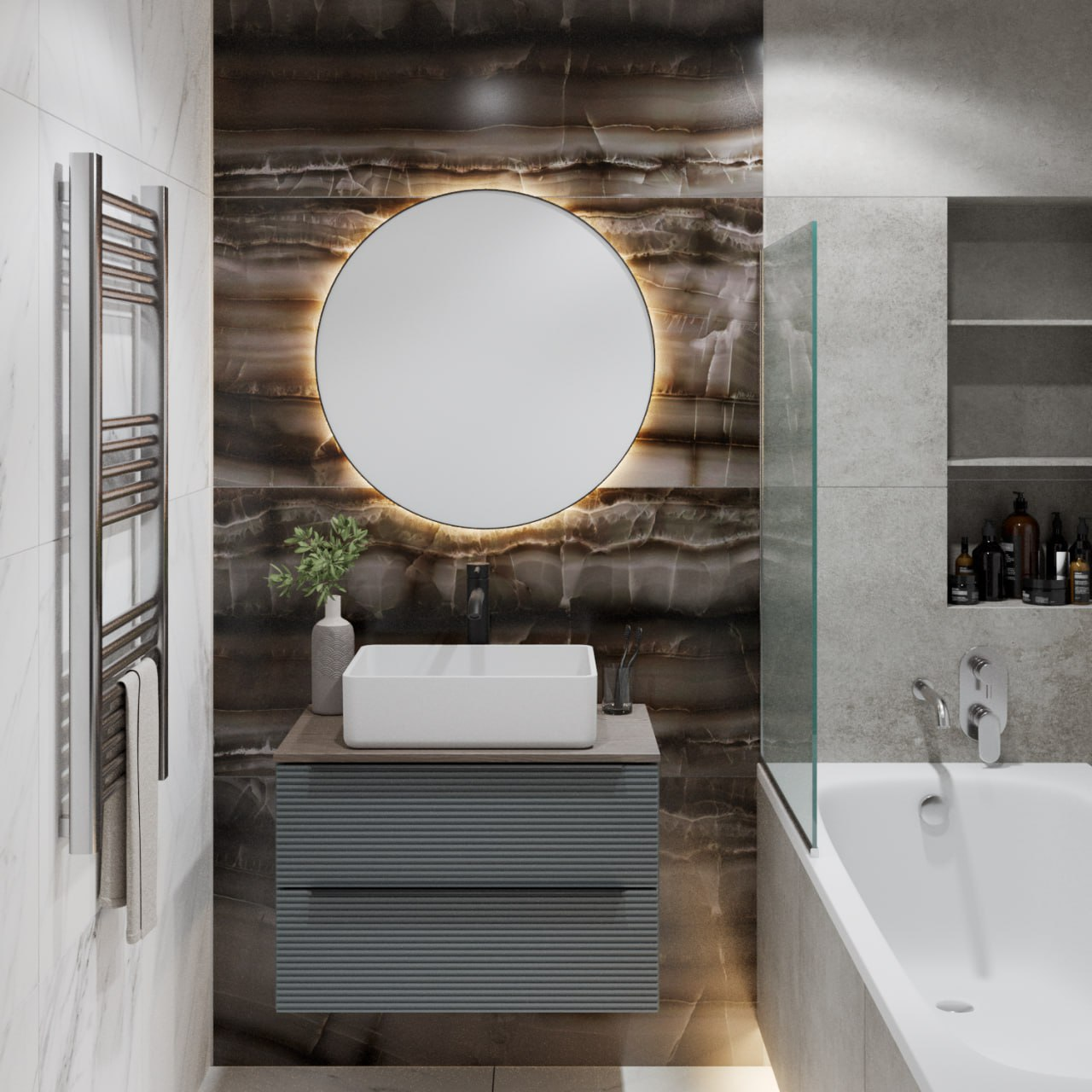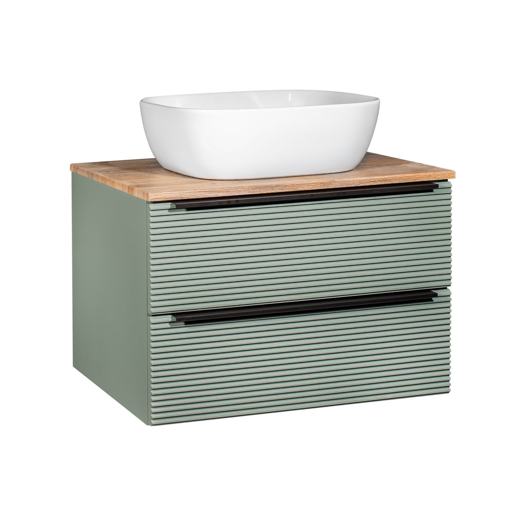 Тумба под раковину в ванную RUNO Орлеан (подвесная) – это изысканность и утончённая роскошь в интерьере. Рифленые фасады визуально «оживляют» и «приводят в движение» всю обстановку комнаты, сохраняя при этом умиротворение и покой. Цвета корпуса и фасада имеют идеальное цветовое сочетание оливкового цвета и цвета натурального дуба, которые идеально впишутся в любой интерьер ванной комнаты. Тумба в ванную оснащена двумя выдвижными ящиками на шариковых направляющих, оснащенных системой плавного закрывания. В комплекте входят: две металлические ручки, навесы для крепления к стене. К тумбе для ванной подойдут умывальники на столешницу: «OVALE 50» (50х36см) - идеальное решение для стильного интерьера ванной, создан для минималистичных интерьеров и подойдёт для санузлов в стиле лофт, минимализм и хай-тек. Строгая овальная геометрически правильная форма раковины, усиливает идею лаконичности в дизайне, устанавливается на столешницу, накладным методом. «PALLA D41» (диаметр 41см) - идеальное решение для стильного интерьера ванной, создан для минималистичных интерьеров и подойдёт для санузлов в стиле лофт, минимализм и хай-тек. Строгая круглая геометрически правильная форма раковины, усиливает идею лаконичности в дизайне, устанавливается на столешницу, накладным методом. «TRE 48» (48х37см) - идеальное решение для стильного интерьера ванной, создан для минималистичных интерьеров и подойдёт для санузлов в стиле лофт, минимализм и Хай-Тек. Строгая прямоугольная форма с округлыми углами усиливает идею лаконичности в дизайне, устанавливается на столешницу, накладным методом. «TERZO 60» (59х39см) - идеальное решение для стильного интерьера ванной, создан для минималистичных интерьеров и подойдёт для санузлов в стиле лофт, минимализм и хай-тек. Асимметричная раковина, которую можно установить любой стороной, дизайнерское решение для нестандартных интерьеров, усиливает идею лаконичности в дизайне, устанавливается на столешницу, накладным методом. И другие накладные раковины бренда RUNO.