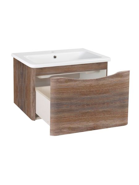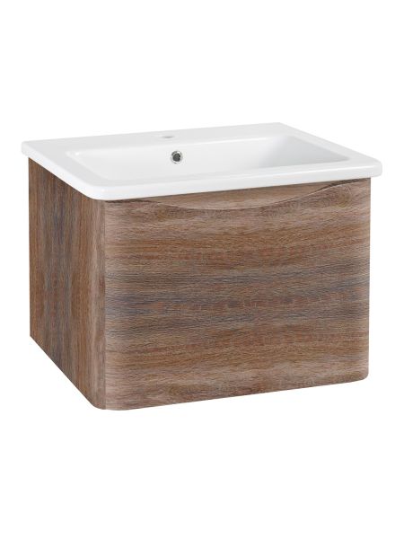 Тумба с раковиной в ванную Runo Тоскана (подвесная) - выполнена в ультрасовременном дизайне в цвете темное дерево. Тумба под раковину отличается изысканным дизайном, скруглённые углы тумбы, древесная текстура фасада, врезная ручка – придают мебели необычный и незабываемый внешний вид. Тумба в ванную оснащена выдвижным ящиком на шариковых направляющих, с системой плавного закрывания. Тумба под раковину ТОСКАНА гармонично впишется в любой интерьер ванной комнаты. Тумба для ванной комплектуется накладным керамическим умывальником Никсон 80 (800х460 мм) ТМ Dreja, необычный дизайн которого сочетание строгих линий прямоугольника со скруглёнными углами, отражают современные тренды в дизайне. Раковина глубиной 16 см. Мебель для ванной комнаты RUNO - красота и практичность в мелочах!