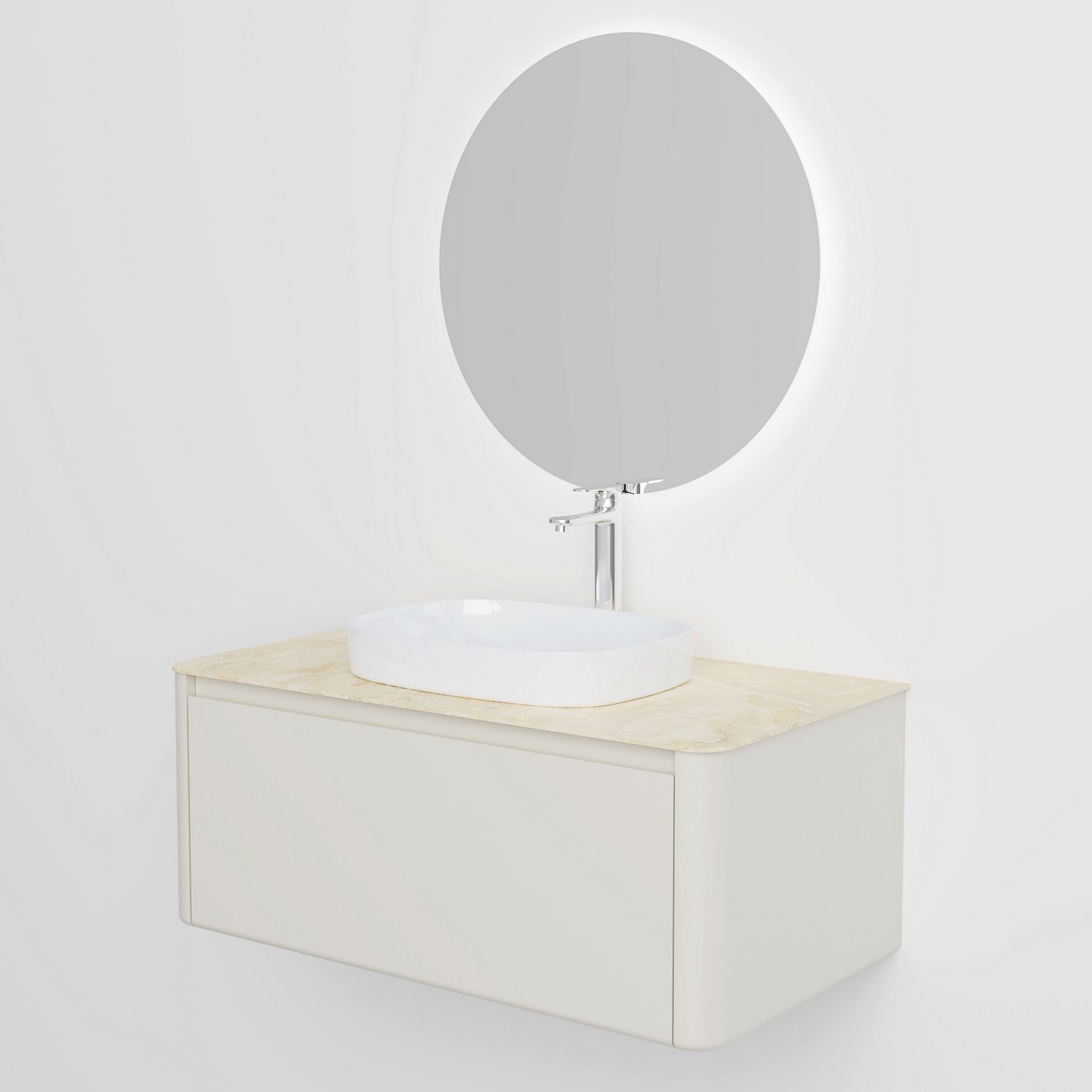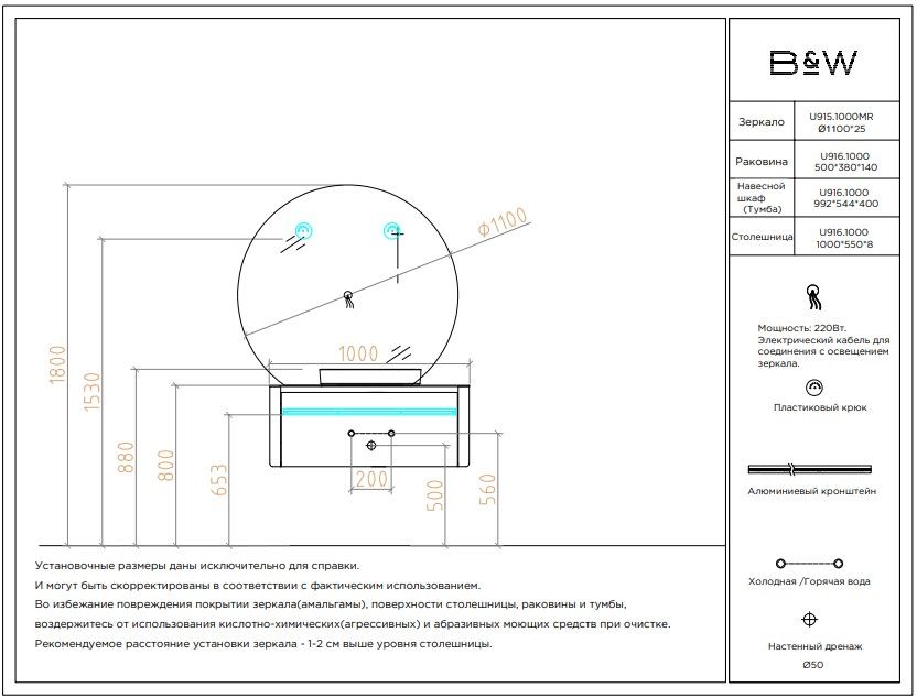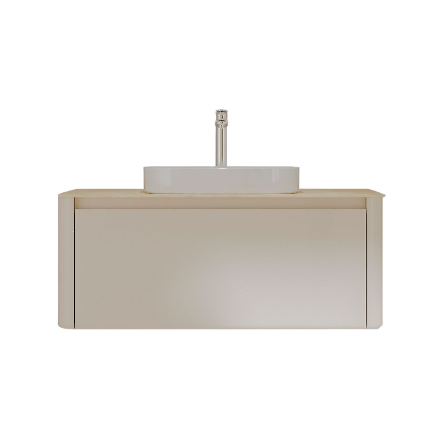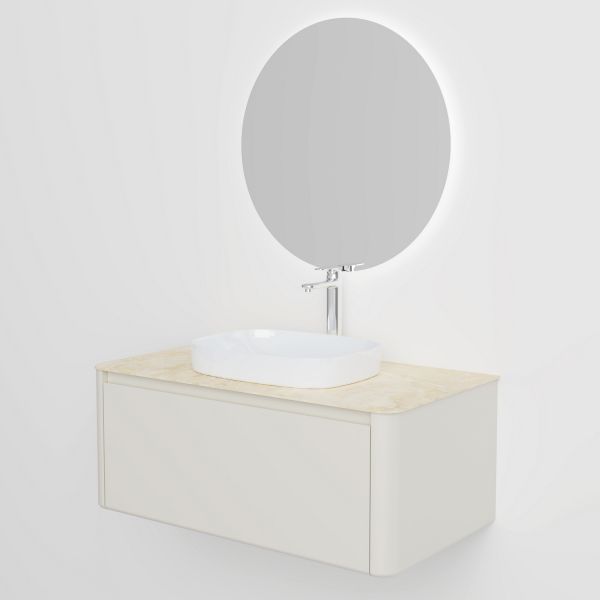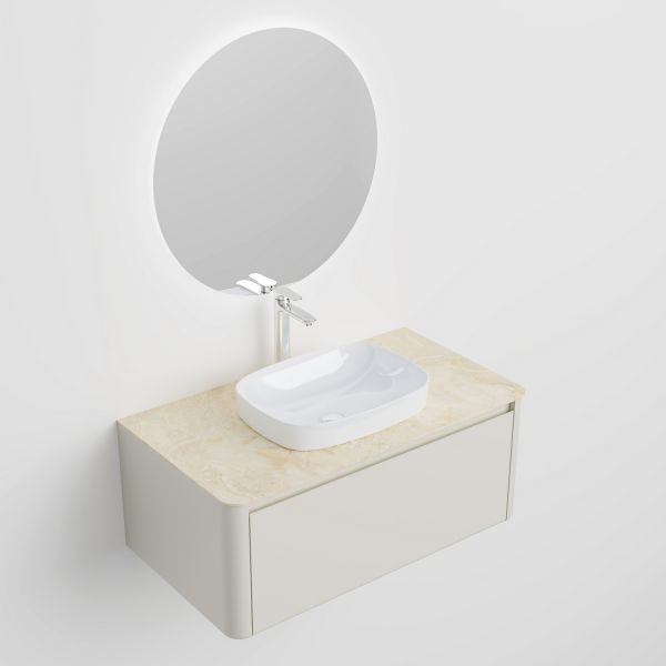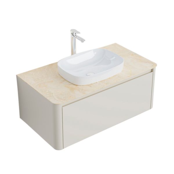 Минималистичная мебель датского производителя Black&White в габаритных размерах 100×55 см. Столешница выполнена из утонченного керамогранита стилизованного под натуральный мрамор кремового цвета в сочетании с белой основой . Полувстраиваемая раковина поставляется вместе с донным клапаном и изготавливается из сантехнического фарфора, а невысокие борта позволяют устанавливать смеситель любой высоты. База изготовлена из влагостойкого MDF и покрыта эмалью в цвете слоновая кость, а для открывания выдвижных ящиков установлены направляющие австрийской компании Blum. Комплект крепежа с крепежной планкой идет в комплекте.