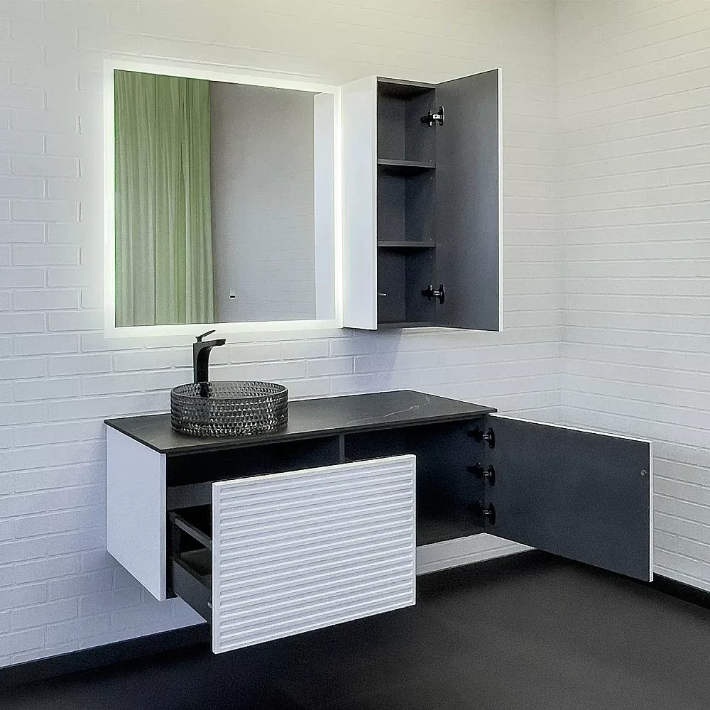 • Подвесная тумба-умывальник с одним выкатным ящиком и створкой.