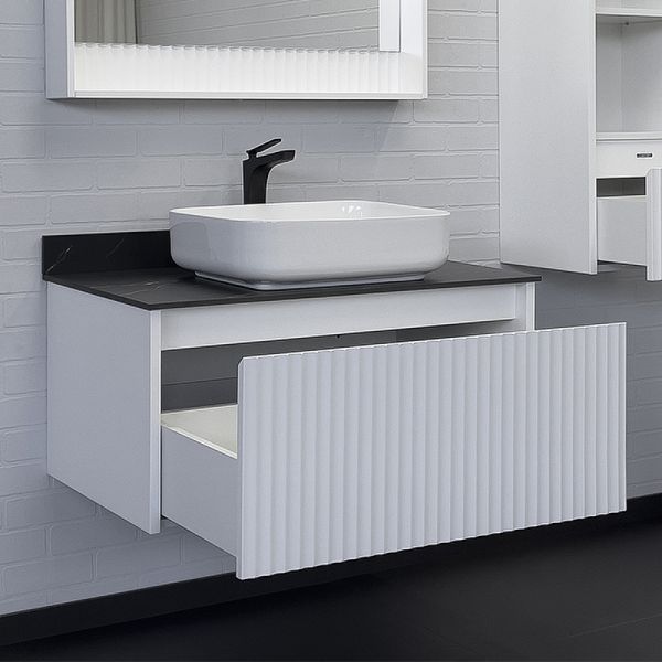 Фасад тумбы фрезерован геометрическим узором с имитацией волны.