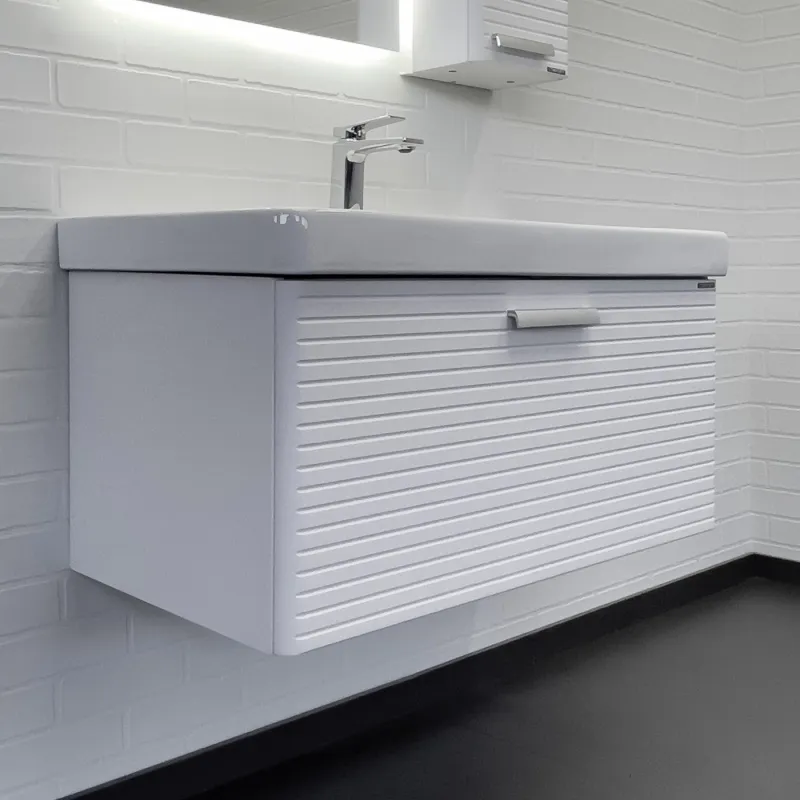 Тумба с раковиной Comforty Танжер 00-00019566 90 см белыйПодвесная тумба с одним широким выдвижным ящиком оснащенным направляющими с системой плавного закрывания. Оригинальные эргономичные ручки цвета хром. Фасады тумбы изготовлены из МДФ, фрезерованы горизонтальным узором и облицованы белой матовой пленкой. Тумба подготовлена для подключения водоснабжения снизу и сзади. В комплекте: керамическая раковина Comforty 4490
