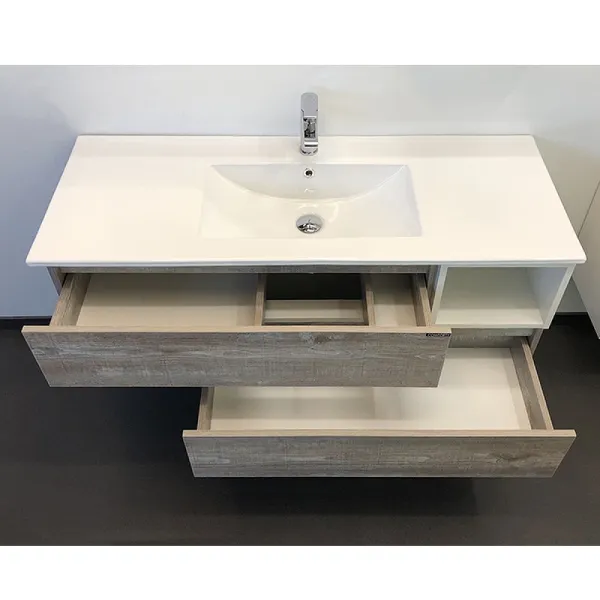 Тумба с раковиной Comforty Турин 00-00013939 120 см дуб бежевыйХарактеристики: Тумба: Цвет: дуб бежевый, белый глянец. Материал тумбы: влагостойкий ЛДСП. Организация хранения: два ящика, две открыты полки. Ящики оборудованы системой плавного закрывания. Монтаж: подвесной. Раковина: Цвет: белый. Материал: санфарфор. Форма: прямоугольная. Одно отверстие под смеситель. Отверстие под перелив. В комплекте поставки: тумба, раковина Comforty 9120E, крепежный комплект
