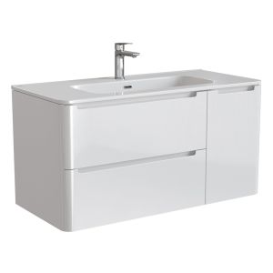 Тумба с умывальником для ванной комнаты, подвесная. Размеры: 467х1002х500 мм (ДхШхВ). Фасад МДФ 19 мм в эмали (белый глянец), фрезеровка. Корпус ЛМДФ 16 мм в эмали. Интегрированные ручки. Два выдвижных ящика с механизмом плавного доведения. Одна распашная дверца с полкой ЛДСП 16 мм. Пластиковый ограничитель под сифон в верхнем ящике. Перекатной организатор в нижнем ящике. Навесы усиленные с планкой. Упаковка: картон, пленка, пенопластовые уголки.