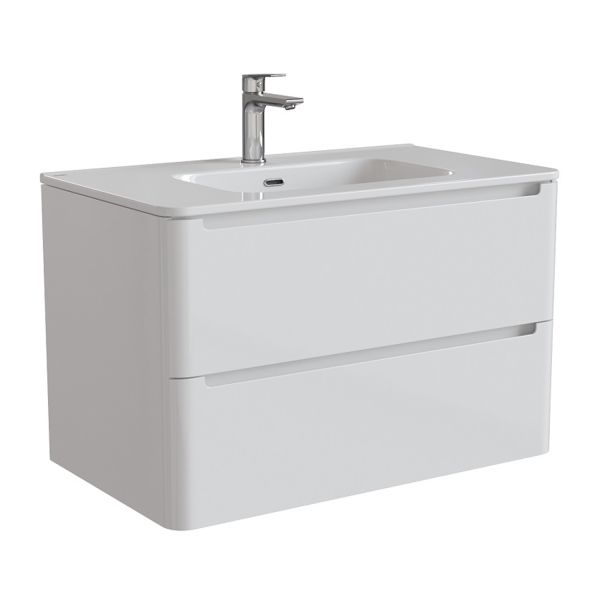 Тумба с умывальником для ванной комнаты, подвесная. Размеры: 467х802х500 мм (ДхШхВ). Фасад МДФ 19 мм в эмали , фрезеровка. Корпус ЛМДФ 16 мм в эмали. Интегрированные ручки. Два выдвижных ящика с механизмом плавного доведения. Пластиковый ограничитель под сифон в верхнем ящике. Перекатной органайзер в нижнем ящике. Навесы усиленные с планкой. Упаковка: картон, пленка, пенопластовые уголки.