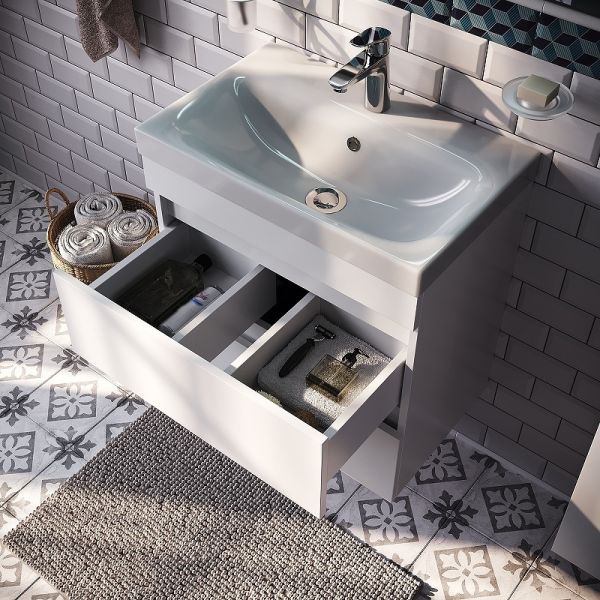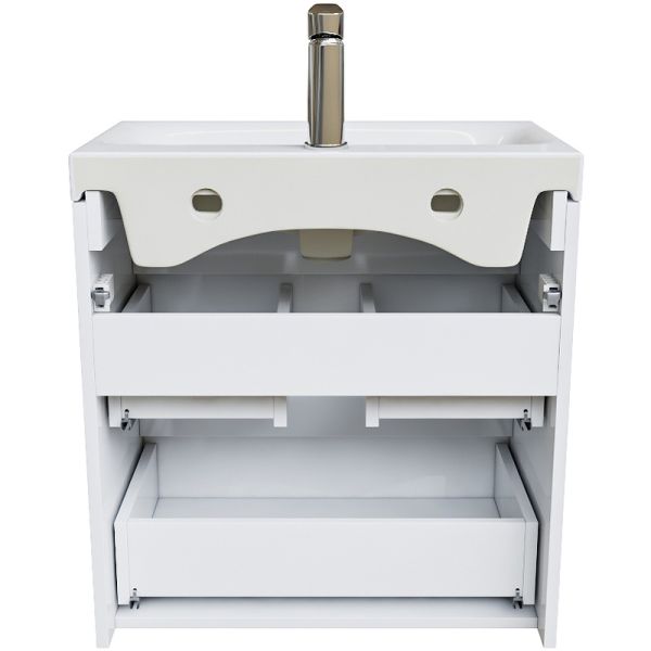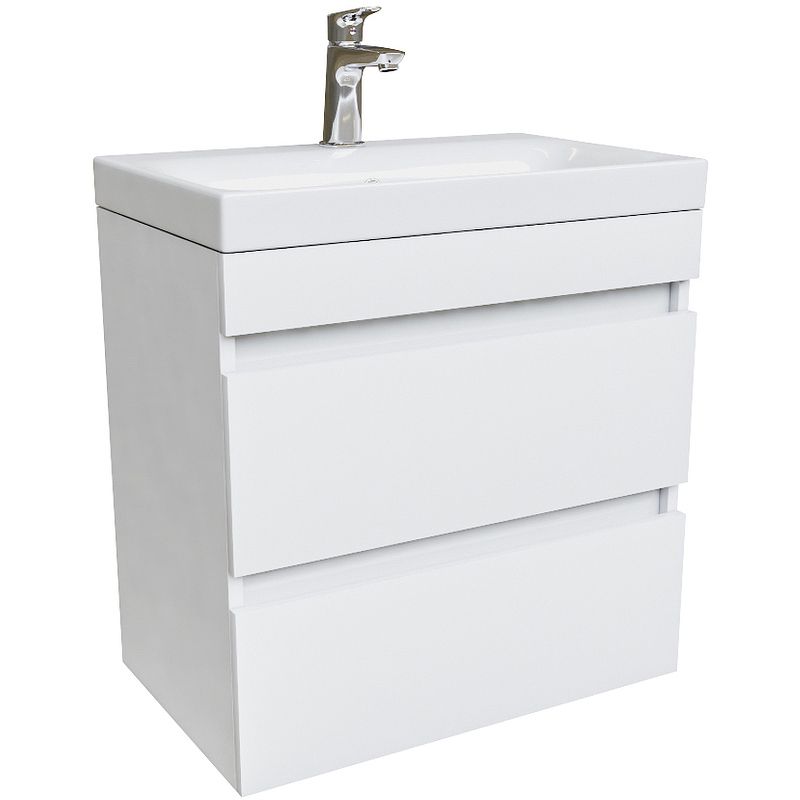 Тумба с раковиной Iddis Zodiac 60 ZOD6CB0i95K подвесная.Фасад и боковины изготовлены из ЛДСП, покрыты несколькими слоями белоснежной эмали. Такое качественное исполнение обеспечит долгий срок службы мебели во влажном помещении ванной (при соблюдении рекомендаций по уходу).Керамический умывальник с высоким бортом и большой вместительной чашей в комплекте. Удобен для гигиенических и хозяйственных нужд.Два вместительных выдвижных ящика с механизмом плавного доведения закрываются плавно и бесшумно. Интегрированные ручки. Фурнитура рассчитана на 30 000 открываний, что составляет более 10 лет исправной работы.Характеристики:Цвет: белый.