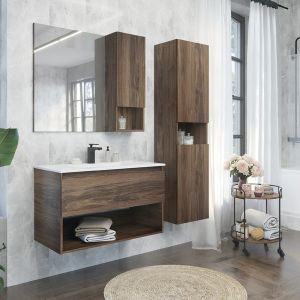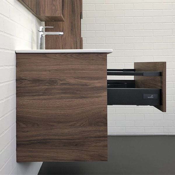 Подвесная тумба с ящиком оборудованным системой плавного закрывания и пространством для открытого хранения.