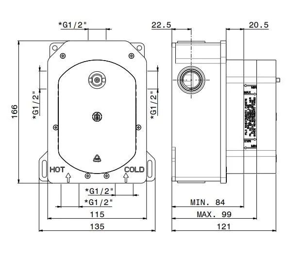 Для работы термостатического смесителя холодная вода должна быть подведена с правой стороны.