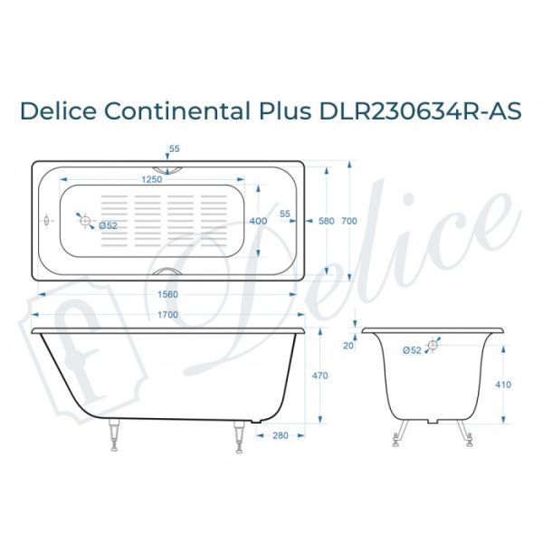 Ванна чугунная Delice Continental PLUS DLR230634R-AS с отверстиями под ручки и антискользящим покрытием 170х70 см
