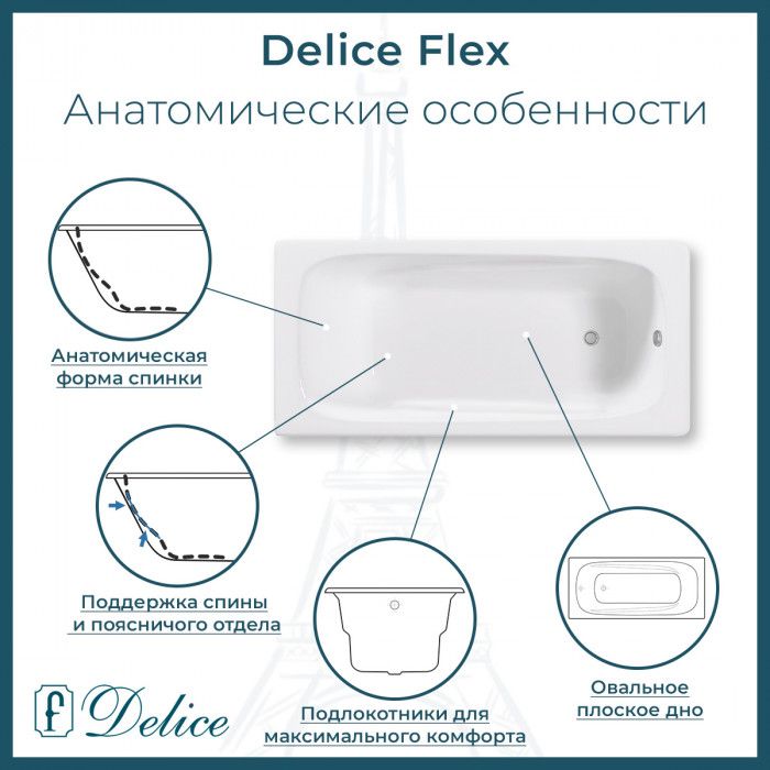 Ванна чугунная Delice Flex 170х80 с отверстиями под ручки антискользящим покрытием купить