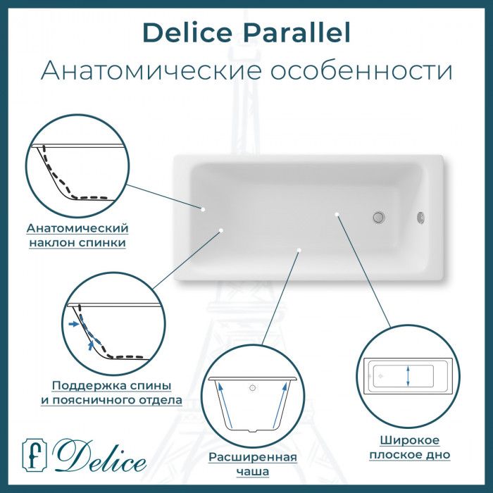 Чугунная ванна Delice - это отличный способ отвлечься от повседневных проблем и избавиться от стресса во время принятия водных процедур. Основным преимуществом ванны из чугуна является простота в уходе и устойчивость эмали ванны перед большинством механических повреждений.Прямоугольная форма ванны идеально подойдет к любому интерьерному решению. Пристенный монтаж - наиболее традиционный вид установки. Оптимальная глубина составляет 46,2 см, что позволяет принимать ванну с максимальным комфортом. Ванна Delice выполнена со строгим соблюдением всех актуальных элементов современного стиля. Ванны Delice производятся с исключительными стандартами качества, по сертифицированным технологиям, с использованием надежных безвредных материалов. Чугунна ванна Delice сделает любое дизайнерское решение не только практичным в плане использования, но и стильным с точки зрения эстетики.
