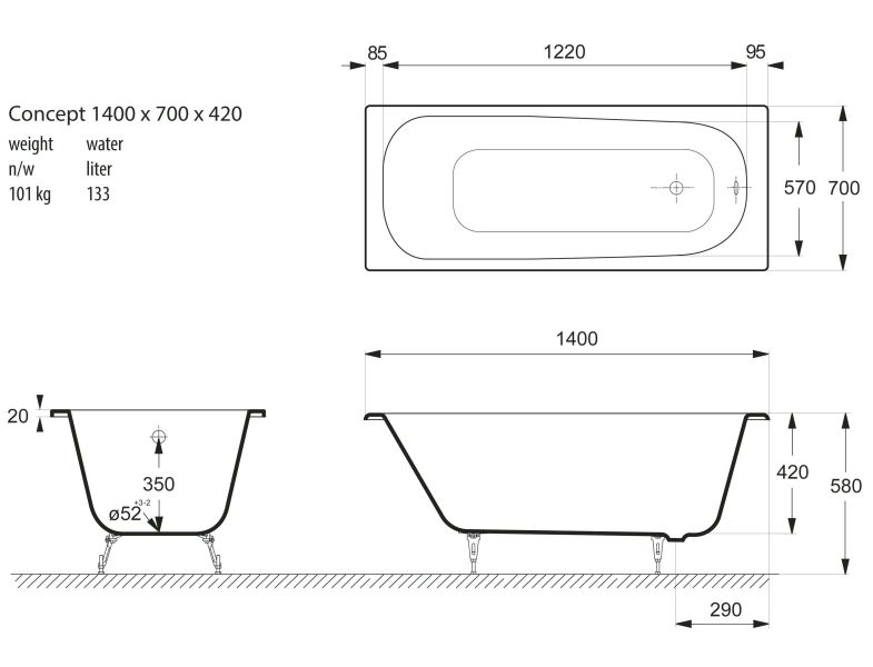 Общие характеристикиРазмер 140х70Длина 140 смШирина 70 смГлубина 42 смВысота на ножках 57 смПолезный объём 188 лВес 101 кгБренд Vinsent Veron7 слёв титановой эмали класса 1АЦвет эмали белыйБез антискользящего покрытияДиаметр слива Ø52Расположение перелива стандартное