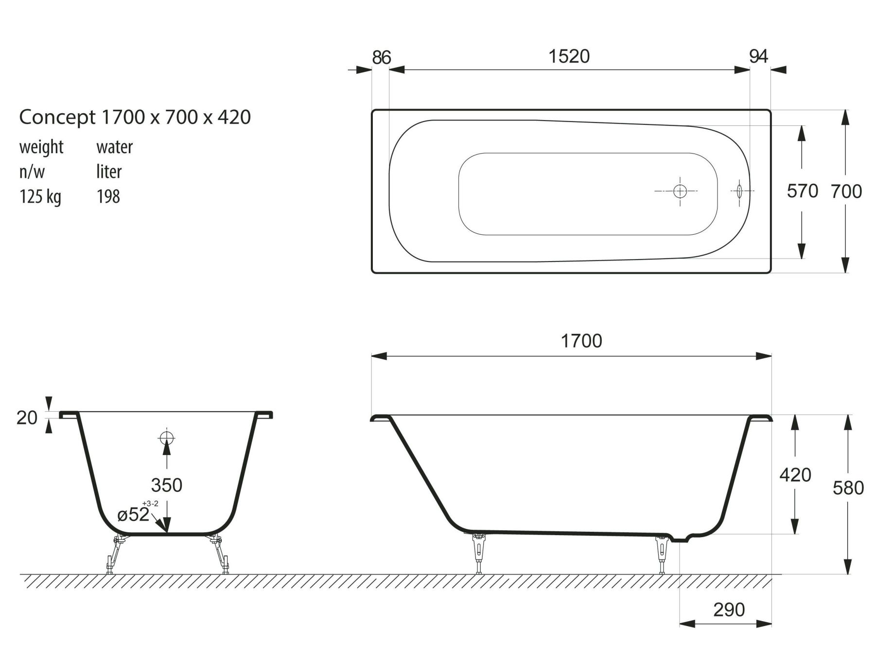 Общие характеристикиРазмер 170х70Длина 170 смШирина 70 смГлубина 42 смВысота на ножках 57 смПолезный объём 250 лВес 125 кгБренд Vinsent Veron7 слёв титановой эмали класса 1АЦвет эмали белыйБез антискользящего покрытияДиаметр слива Ø52Расположение перелива стандартное