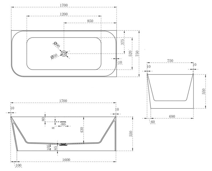 Ванна из искусственного камня ABBER Stein AS9621-1.7 R правая 170x75см белый матовый