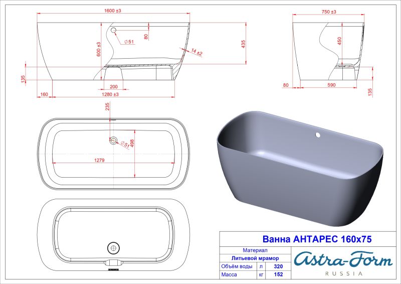 Ванна из искусственного камня Astra-Form Антарес 01010019 160x75 см белый глянец