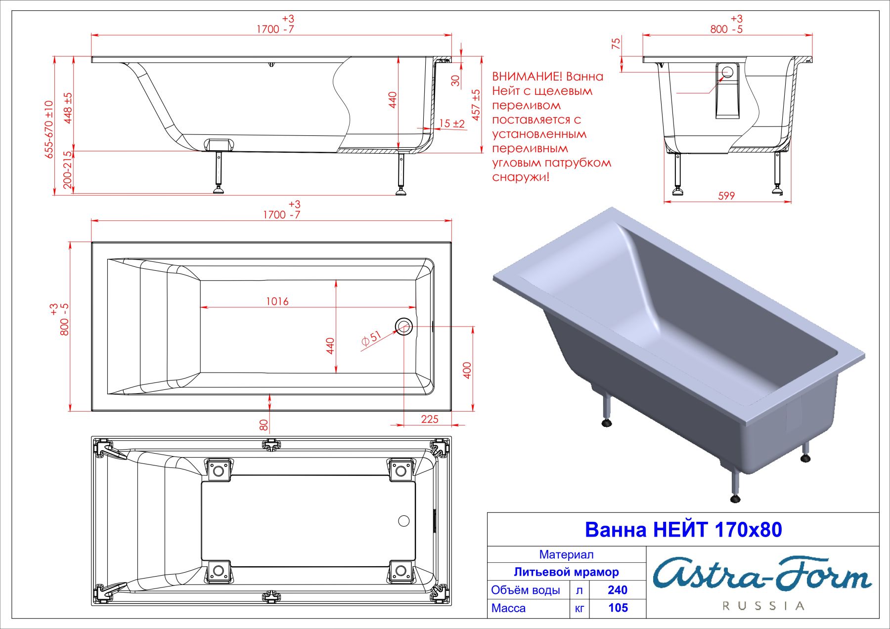 Ванна из искусственного камня Astra-Form Нейт 01010033+08010053 170x80 см с щелевым переливом донный клапан белый глянец купить