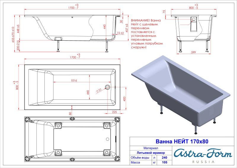 Ванна из искусственного камня Astra-Form Нейт 01010051+08010054 170x80 см с щелевым переливом донный клапан белый матовый