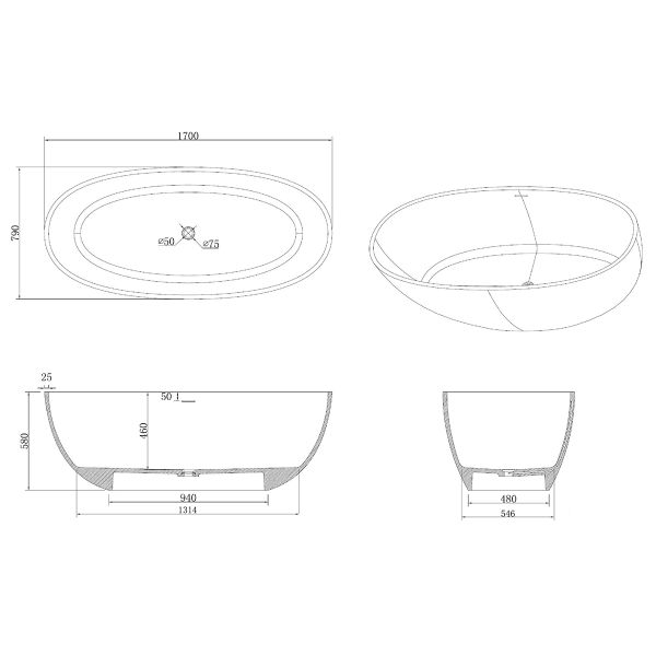 Ванна из искусственного камня Azario CHARTERS CHA17079S свободностоящая 1700х790х580