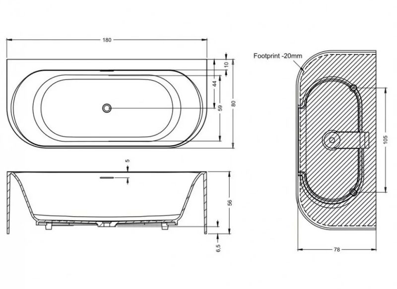 Слив-перелив уже установлен: перелив выполнен в виде удлинённой щели, слив - в виде нажимного клапана Push-Open белого матового цвета, как и ванна.