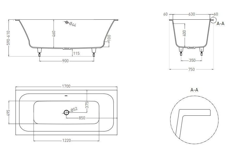 Она предназначена как для полного или частичного встраивания, так и для пристенной или угловой установки. Ванна характеризуется одинаковым уклоном бортов и расположенными посередине сливом-переливом и донным клапаном. Название модели Axis («Ось) отражает характерную симметрию ванны во фронтальной проекции.[1]