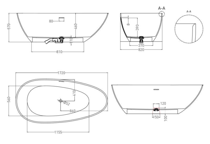 Ванна из искусственного камня Salini Paola In S-Sense 101612GRF 172x82см RAL полностью