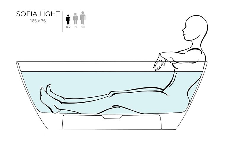 При габаритах 165х75 см SOFIA LIGHT будет идеальным вариантом как для больших, так и для маленьких ванных комнат, где одинаково важны чистые линии и повседневная практичность. Эта модель идеально подойдёт как для расположения у стены, так и для размещения в центре комнаты.